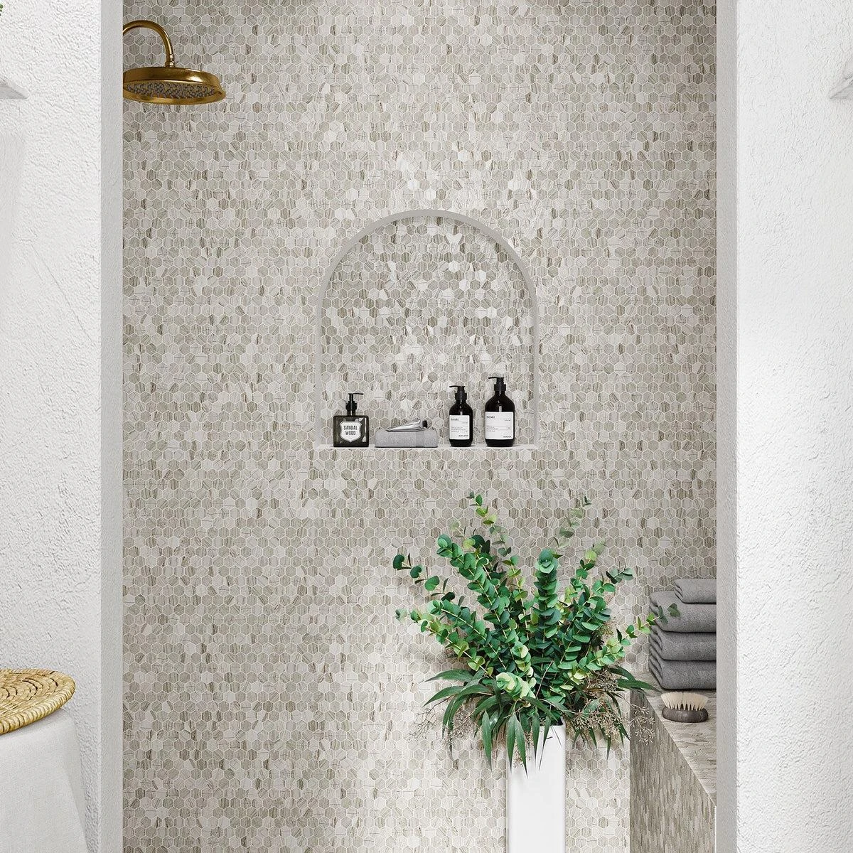 Install our 1 inch hexagon tile for a beautifully detailed flooring option or use these polished marble hexagon tiles on a shower floor or wall to accent organic home decor! It will be a perfect beige hexagon floor tile for residential and commercial settings. love these earthy neutral tiles paired with any color of bathroom fixture or cabinet paint color, offering endless styling opportunities that can fit any home aesthetic!