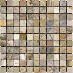 A natural stone backsplash or flooring can look exotic in every living space. Fantasy Square multicolor mosaic tile consists of a striking blend of gray, brown and green tones to bring a warm and natural feeling to your design. The rich color tones found in this mosaic tile can complement a variety of modern and traditional designs. This square tile is backed on a mesh for easy installation. You can use it as a stone backsplash and add an organic touch to your cooking space. It is also a great addition to your bathroom design as tile flooring since grout lines between small tile pieces provide extra slip resistance. Fantasy Square can also boost the ambiance of your living room when used as a fireplace tile. Wherever you choose to install, this decorative tile will easily enhance your design and boost the value of your home. Due to the nature of stone, variations in color, pattern, and veining may occur.
