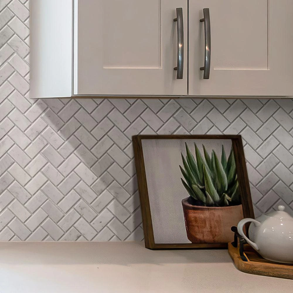 Tile Club’s 1×2″ White Carrara Herringbone Polished mosaic tiles have a distinctive, delicate pattern that will make your space stand apart. Made of white marble with beautiful grey veining, these rectangular tile pieces create a V-shaped zigzag known as the herringbone pattern, creating intricate-looking designs without extra work. Tile Club’s Carrara marble tile herringbone pattern can be applied to almost any décor due to its versatility in design! You can truly personalize your space with this white marble mosaic and break up a dull space with some geometric details. Its bright tone can perfectly match with the other elements in your decor. With white marble herringbone tiles, you can create eye-catching backsplash areas in your kitchen and bathroom! They can bring life to a dull space and interest to your plain décor without mixing different colors. It can also be a great Carrara herringbone floor tile for residential and commercial spaces. No matter where you choose to install, Bianco Carrara marble herringbone tiles will offer a timeless look in any setting.