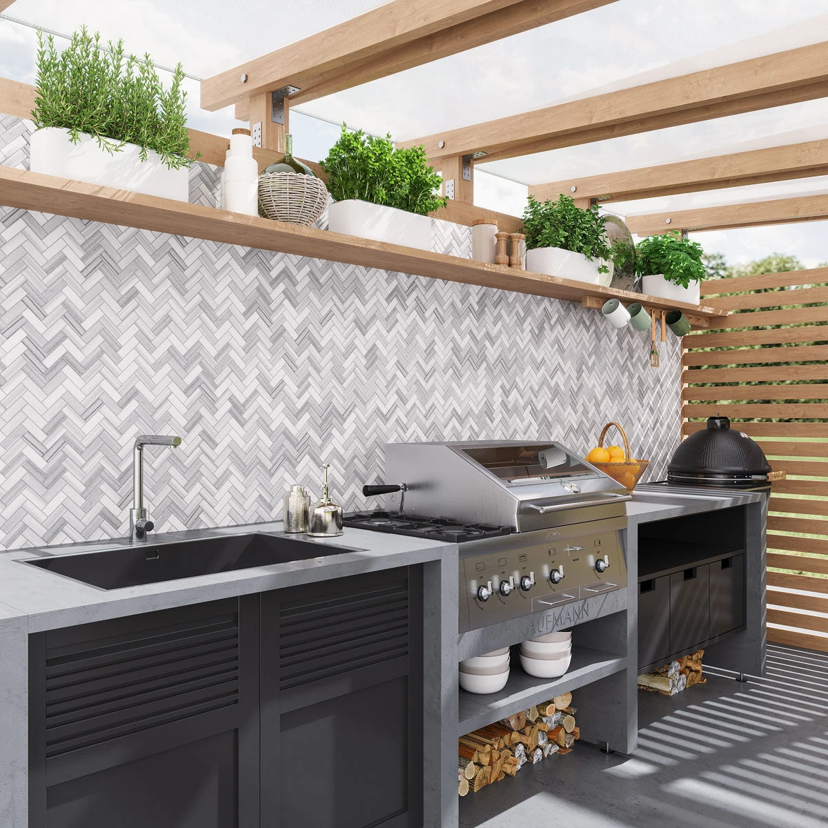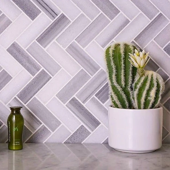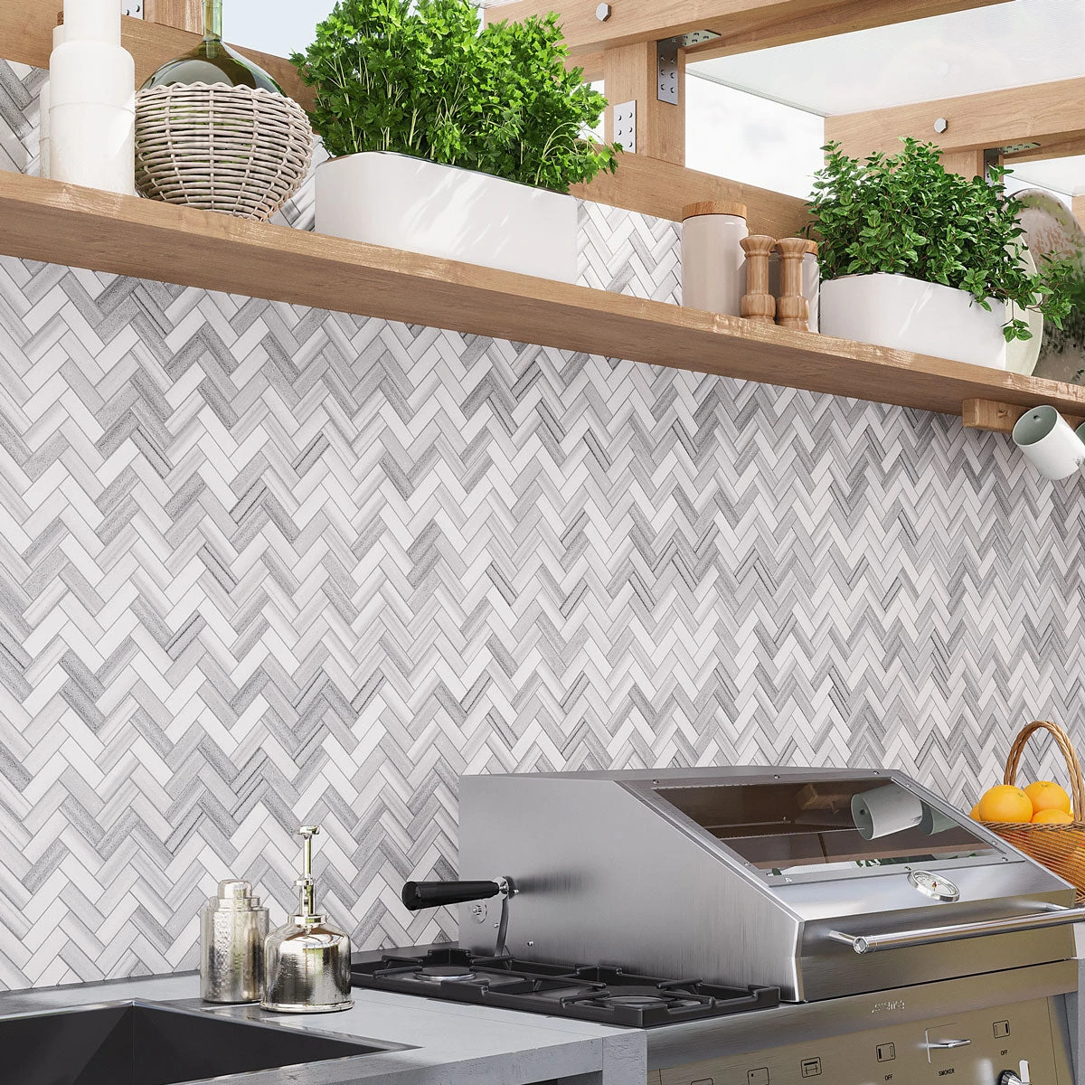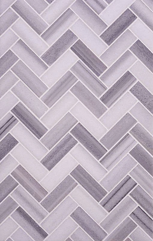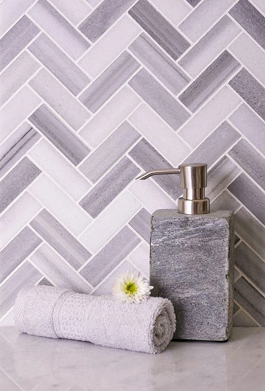 If you are looking for a sophisticated look with natural stone tiles but prefer some pattern, consider going with our Equator Herringbone mosaic tiles. Equator marble tiles are arranged in a herringbone pattern and laid on a mesh to form this unique mosaic tile that is an attention-grabbing piece. Equator marble is a white and gray marble with linear veins, quarried in Turkey. The parallel veining makes this marble tile so unique and distinct that you can easily create an eye-catching focal point on any surface. This herringbone pattern mosaic tile can give your kitchen or bathroom a classic feel while still enjoying a playful pattern. This pattern is a great choice for flooring due to grout lines that provide extra slip resistance. White herringbone backsplashes are as popular as the flooring in kitchens and bathrooms. They are the perfect opportunity draw attention on your walls and bring some added detail to a dull space. Due to the nature of stone, variations in color, pattern and veining may occur.