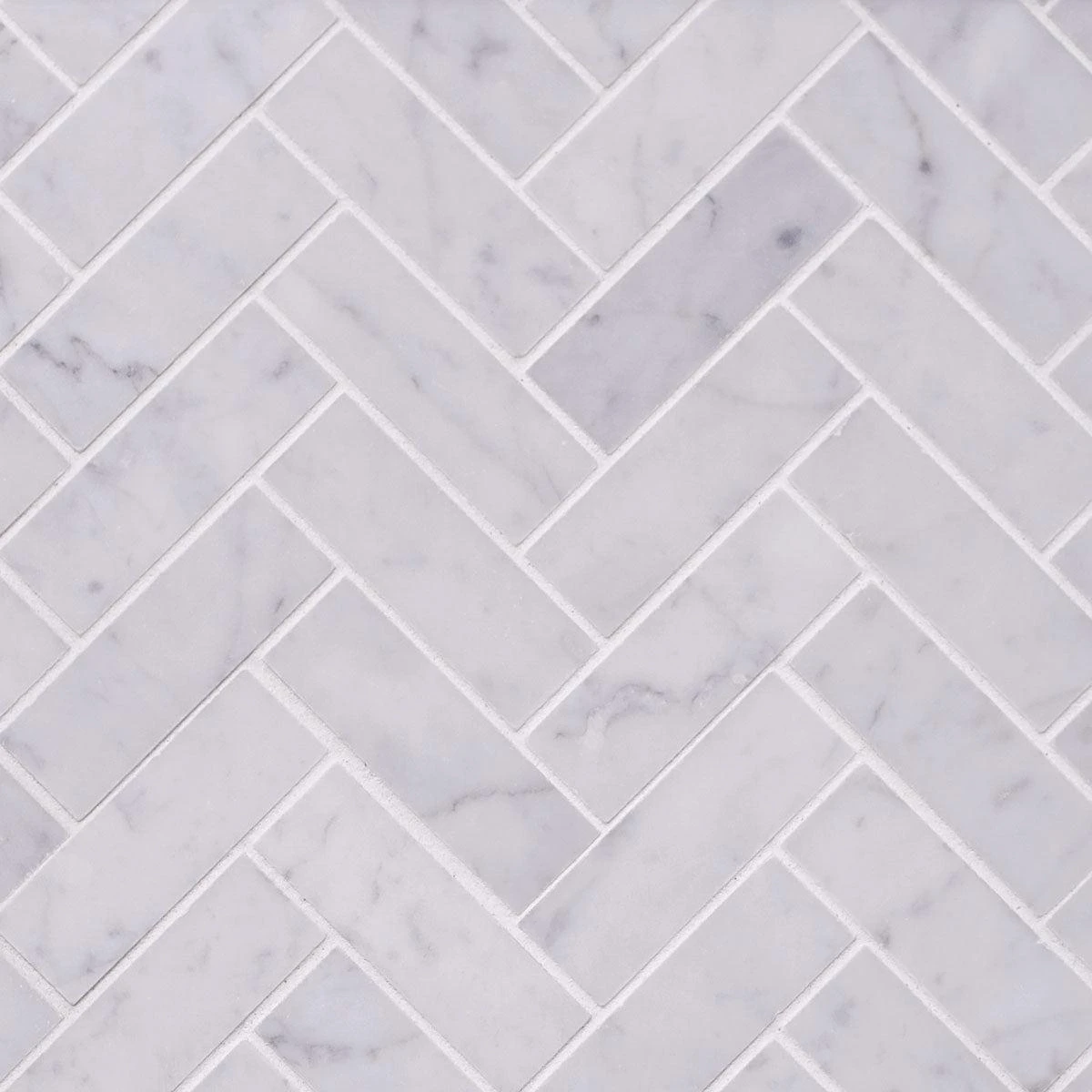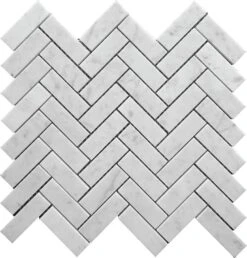 Carrara 1×3” Herringbone Honed mosaic tiles have a distinctive, delicate pattern that will make your space stand apart. Made of Bianco Carrara white marble a beautiful grey veining, rectangular tile pieces create a V-shaped zigzag known as the herringbone pattern, creating intricate-looking designs. Mosaic tiles in a herringbone pattern can be applied to almost any décor due to its versatility in design from a white marble backsplash design, a slip-resistant shower floor, or even a herringbone fireplace surround in beautiful marble. You can truly personalize the space with this white herringbone tile and break up a dull space with some geometric illusion. Its bright white tone can perfectly match with the other elements in your decor. With herringbone tiles you can create eye-catching backsplash areas in your kitchen and bathrooms. They can bring life to a dull space and interest to your plain décor without mixing different colors. Carrara 1×3″ Herringbone Honed can also be a great bathroom wall tile either used alone or as a border running through classic subway tiles.