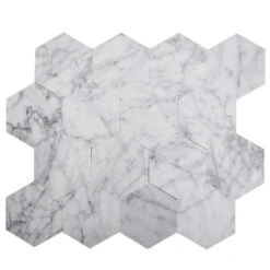 2.5″ Carrara Hexagon peel and stick tile is easy to install yourself, making this product a great option for a DIY remodel, someone who is new to tile installation, or anyone who wants to give their home a beautiful upgrade! Prep your surface area to ensure a smooth grip, measure out your area for these interlocking 9″ x 10.25″ peel and stick tile sheets, peel off the backing, and apply! We have more Peel and Stick Tiles in our Collection!