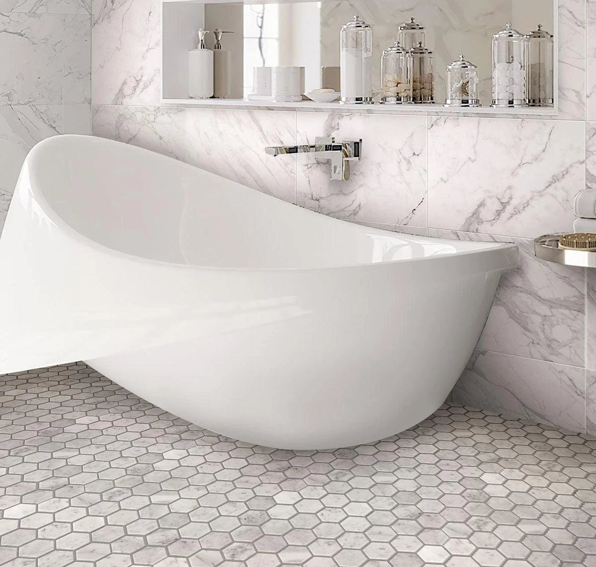 *Natural stone tiles may display variations in color, finish, strength, and slip resistance. White marble may contain naturally occurring iron deposits that can lead to discoloration if used in areas prone to wet or damp, or if exposed to harsh chemical cleaners. As this is an inherent feature of the material, Tile Club does not assume responsibility for discoloration of marble or other natural stone tiles. To ensure you enjoy your white marble tiles for years to come, we recommend installing them in areas that are not prone to standing water, and regularly sealing your tile and grout.