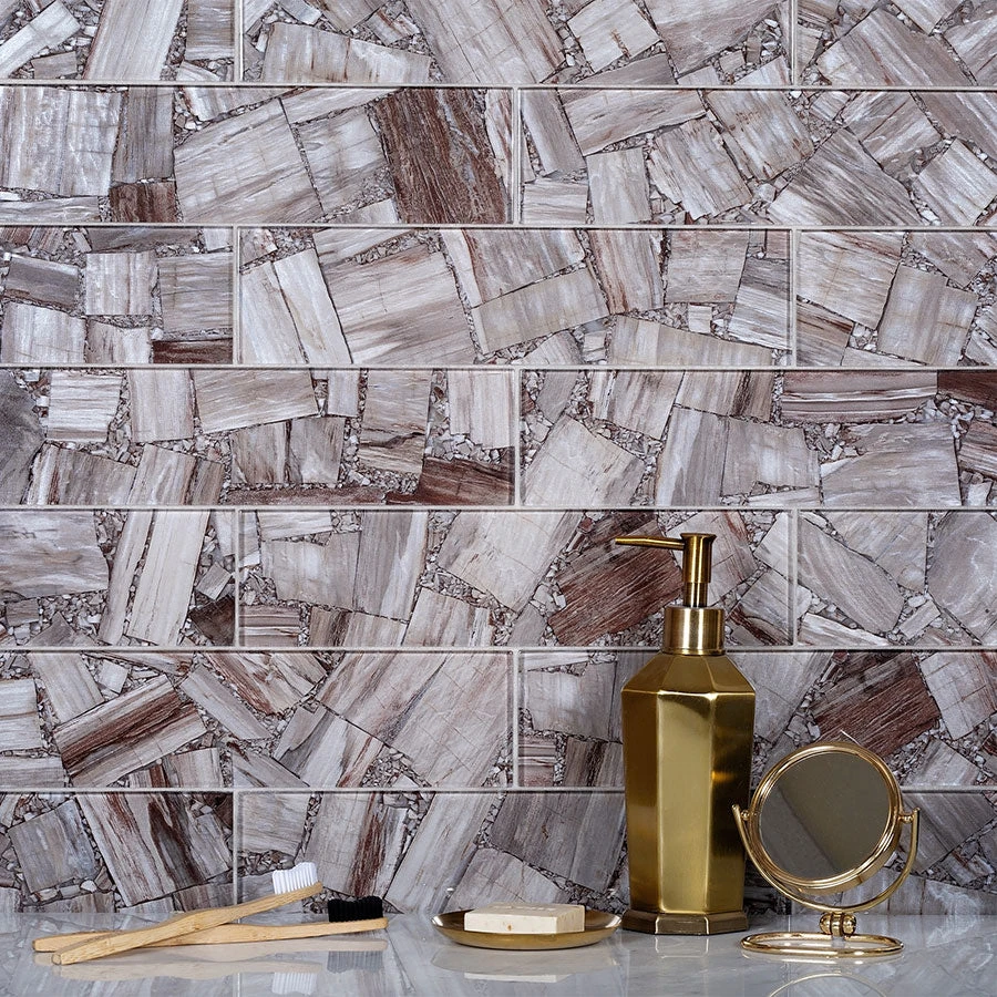 The look of natural stone with the long-term wear and durability of glass – these 3″ x 12″ Agate and Shale Glass Tiles have it all! These polished glass subway tiles have an inkjet printed pattern of crushed agate and shale to offer an organic element and glossy finish that can be used anywhere in your home! These 3″ x 12″ tiles are ideal for installation as an interior or outdoor wall covering, a low traffic floor in your home, or a great shower option that adds a natural feeling to your bathroom! Add a patterned backsplash to your kitchen or wet bar – the glass finish means these natural stone-patterned tiles wipe easily to make cleaning up a breeze!
