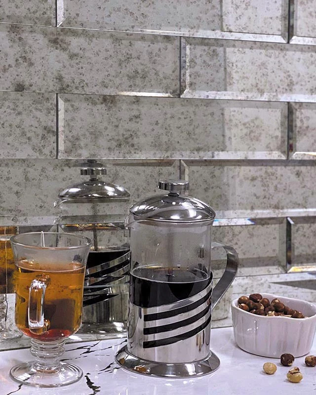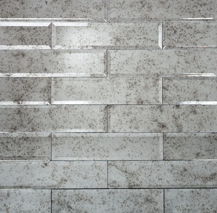 Our beveled antique glass mirror subway tile is one of the most popular tiles for bathroom and kitchen. The unique finish and beveled edge of this mirror tile design delivers a vintage touch to any of your interior projects. This product can enhance both residential and commercial spaces. 3″ x 12″ glass subway tile creates a timeless look great for accents and full-surface installations. Use this vintage-look mirror subway tile for walls in general areas and showers. It is a charming antique mirror glass backsplash tile to accentuate your interior design. Add a brilliant accent to your home with our beveled glass tile!