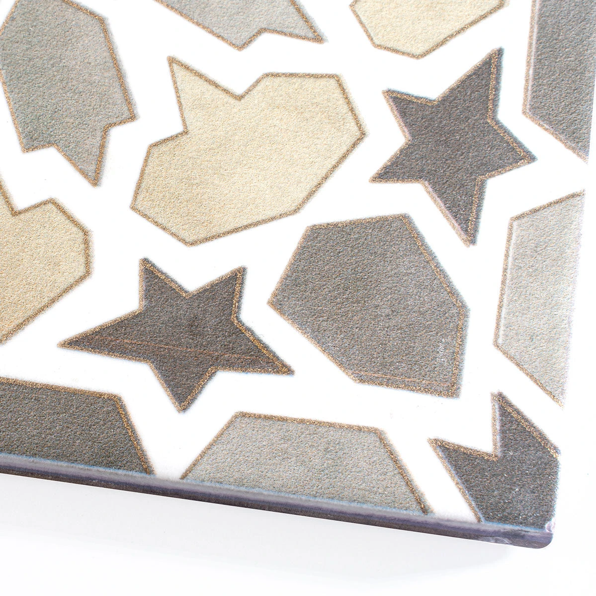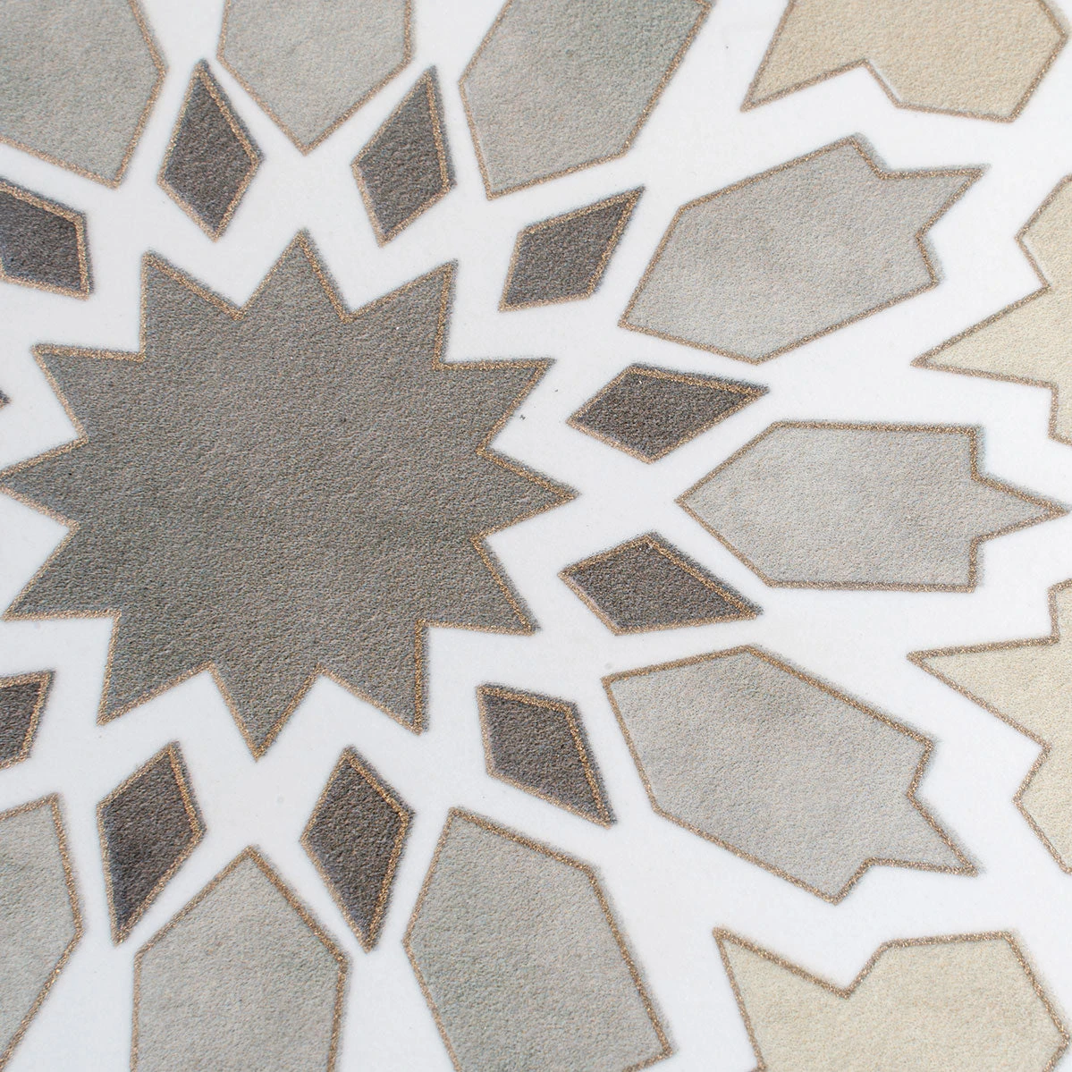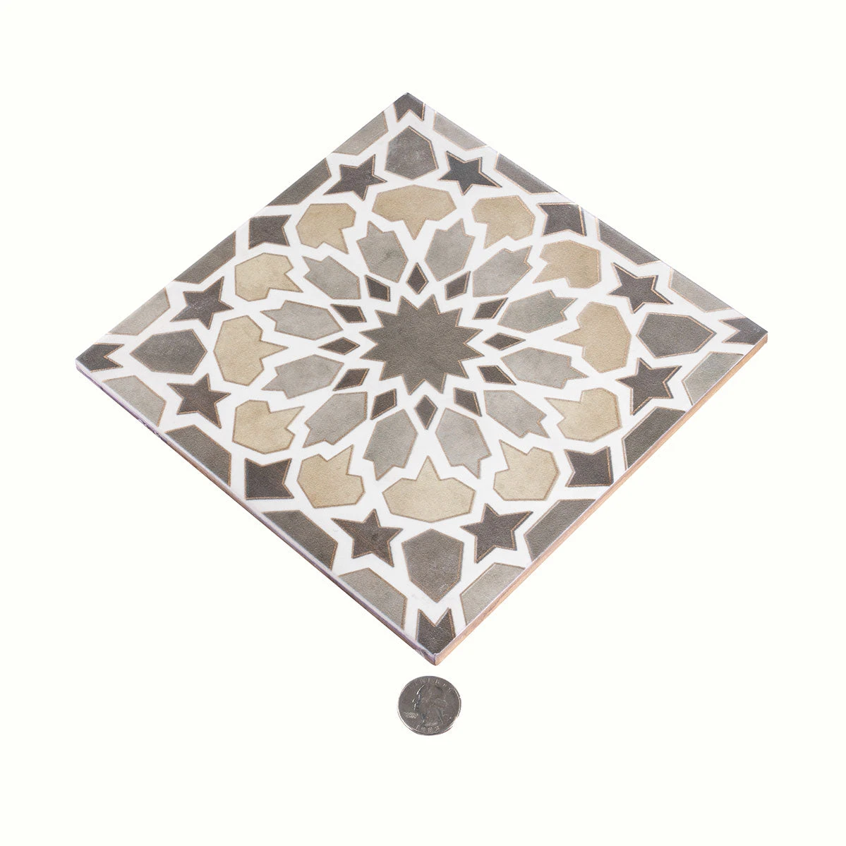 In addition to their rich neutral pattern, Amira Regal Taupe and Gold tiles have genuine gold paint to give them a beautiful luster. Our encaustic patterned tiles work beautifully as an accent wall, fireplace surround, or a distinctive floor design in residential spaces.
