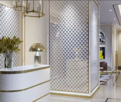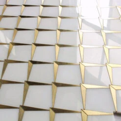The sophisticated look of this waterjet makes it a perfect addition to any interior design! The classic diamond tile pattern is gently decorated with brass gold arrows to bring a luxurious glamorous touch to any of your designs. The immaculate white color of Paper White marble matches every theme and sets up a fresh, clean feeling that can accent any home decor. The glossy tile finish creates a gentle shimmer that makes any room larger and lighter. These marble and brass mosaic tile sheets are interlocked for fast and problem free applications. It is a popular choice to upgrade trendy all-white designs in your kitchen, entryway, bathroom, shower, or other interior spaces. Refresh your home with a white kitchen backsplash, create astonishing shower walls or jazz your ambiance with a gorgeous accent. This white marble and brass tile adds a gorgeous shine to your home decor, whether you choose to create an eye-catching geometric fireplace surround as a focal point in your living room with a dazzling metallic accent.