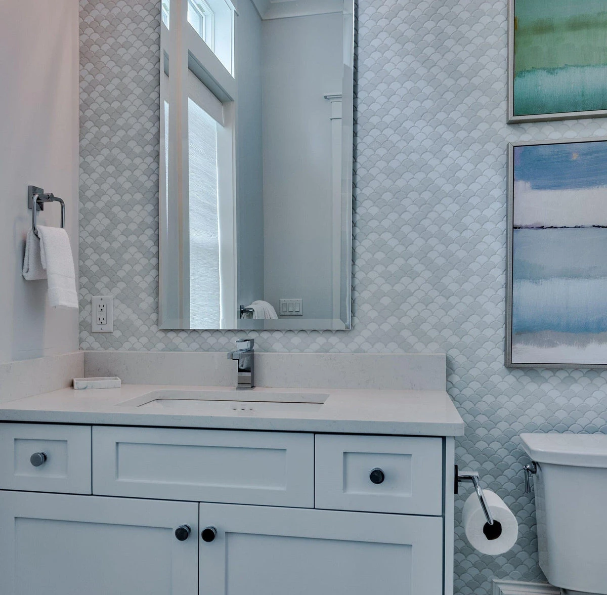 Give your home a mermaid tile makeover! The soft curves of this fish scale mosaic tile offer a contrast to the traditional angles we’ve been seeing in home trends. The beautiful harmony of whites and blues with the Thassos, Carrara, and Blue Celeste marble tiles appear in scalloped curves that create visual interest but not too busy. Mosaic tile with a simple fish scale pattern can be used for kitchen backsplash or bathroom wall without overwhelming the space. Due to the small size in shapes and a lot of grout lines within the pattern, these marble tiles are also ideal for floors where slip resistance is required. Design with fish scale mosaic tile if you want to add an element of dimension and but want to avoid a boxy look. Due to the nature of stone, variations in color, pattern and veining may occur.
