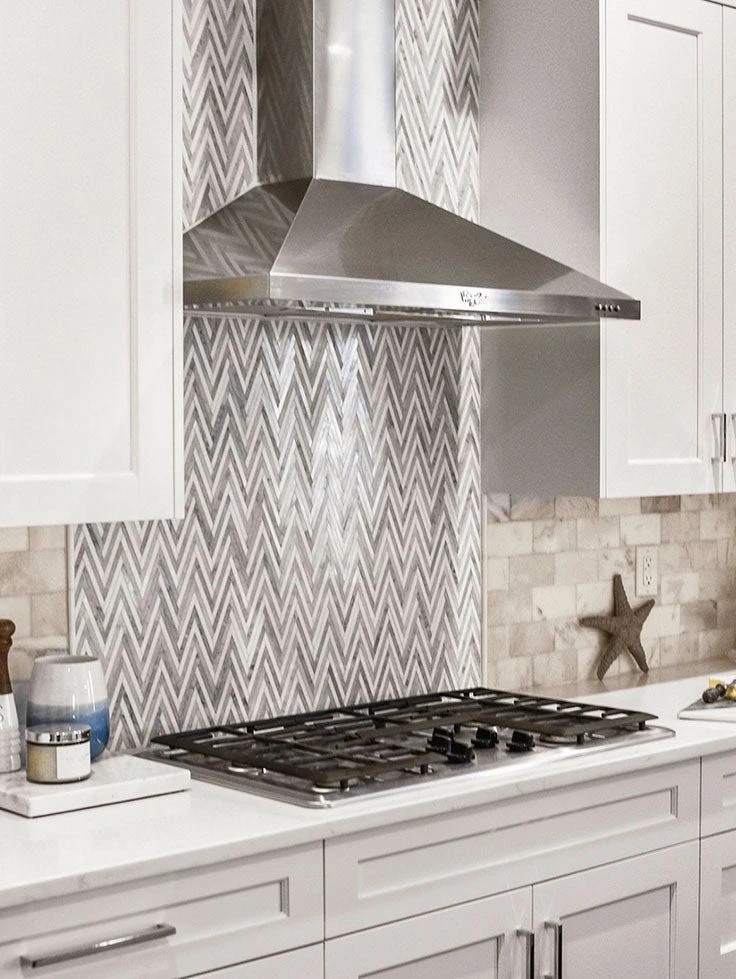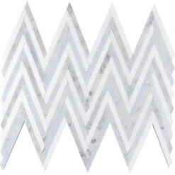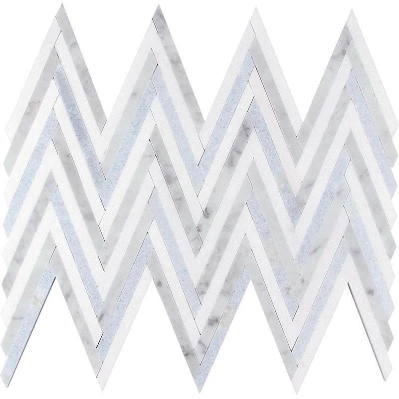 This mosaic tile comes to provide a dynamic and rich elegance that will enhance the atmosphere of your space when you upgrade your kitchens, bathrooms and other living spaces. A beautiful blend of the classic Bianco Carrara and Thassos marbles with a touch of Blue Celeste create a classy form of zigzag pattern in this mosaic tile. If you want to keep things traditional with marble tile but want to spice up the space a little bit, this multicolor zigzag pattern is a great choice. As durable as it is stunning, this Carrara Striped Chevron Mosaic Tile tile is suitable for both residential and commercial applications. Give a timeless appeal with natural stone beauty and some character with the zigzag pattern with this stunning mosaic tile to create beautiful backsplashes, shower surrounds, accent walls and even tile floors throughout your home.