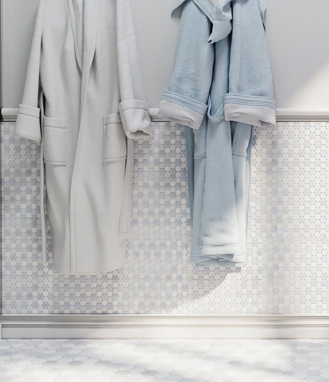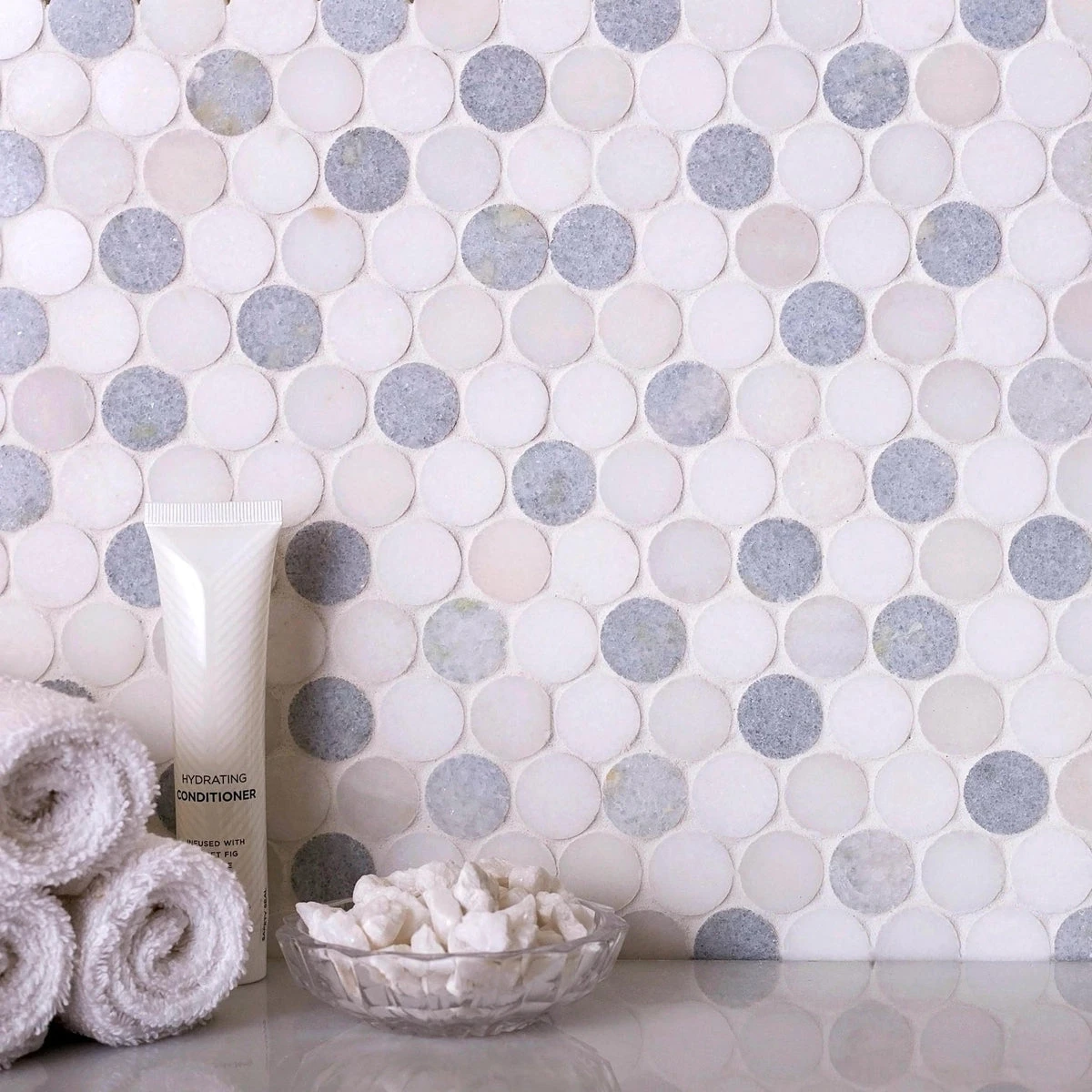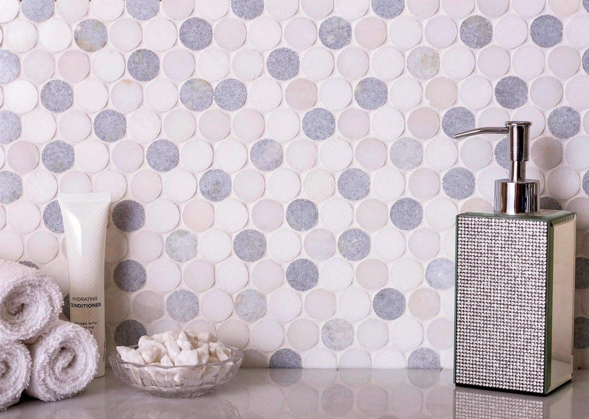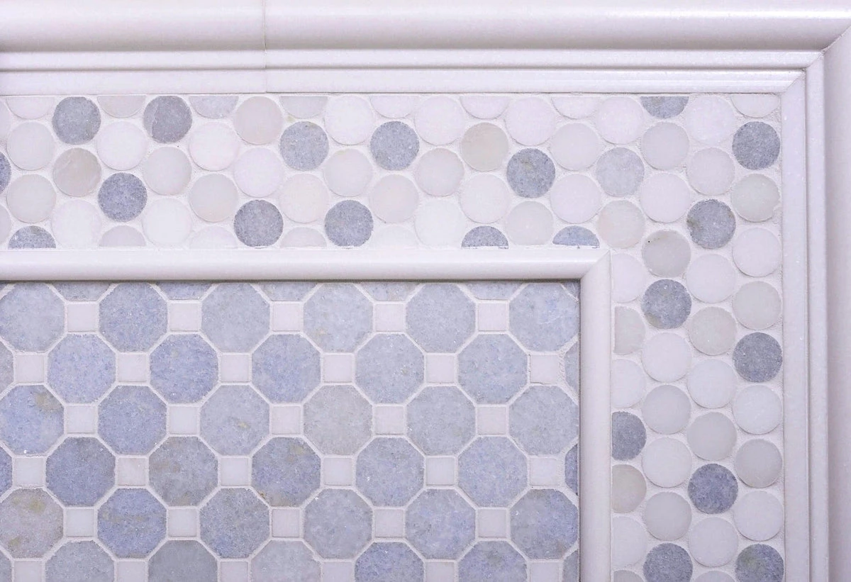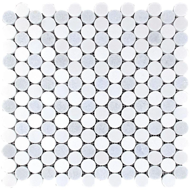 Penny round mosaics offer a classic and graphic look while the simple geometric design delivers a clean look. These mosaic tiles feature a honed finish with muted white shades from Thassos and Paper White with a touch of color with Blue Celeste marble. You can give your space visual depth and character by installing penny round mosaics while keeping the minimalistic aesthetic in the space. These mosaic tiles are suitable for both floor and wall applications in residential and commercial settings. Penny shapes are not only attractive for their visual appeal but they also provide slip resistance, which makes these mosaic tiles ideal for slippery surfaces such as shower floors and high traffic areas.