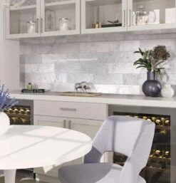 With the rise of the all-white kitchen trend, this white marble subway tile backsplash is also a perfect choice to design a bright ambiance that is both chic and minimal. You can give your open shelving a greater design impact by laying this tile in a vertical running bond pattern to create the illusion of taller ceilings and show off your taste of luxury detail!