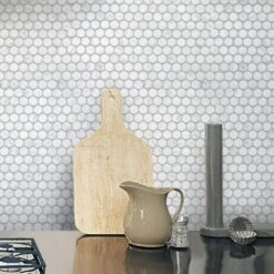 Bianco Carrara penny round honed marble tiles can be used easily both indoors and outdoors depending on the aesthetic you are trying to achieve. For a penny tile bathroom, these Bianco Carrara tiles are very neutral and beautiful – they can be matched with natural foliage and natural metals alike. Think greenery in brass flower pots or a matching marble side table for all your toiletries. Whenever using white marble as the backdrop, it looks spectacular to pair decor elements that are also fairly organic and natural. At the same time, this Carrara marble penny round tile can be used with gold and rose gold fixtures and decor for a shabby chic effect whether you’re doing a full penny tile bathroom or simply a shower floor. In the kitchen this design makes for a stunning penny tile floor and backsplash to immediately make the kitchen look upscale and fashionable.