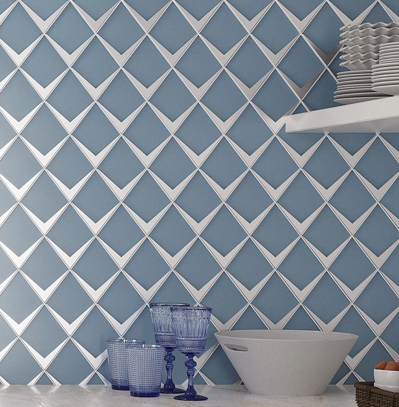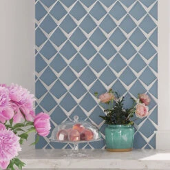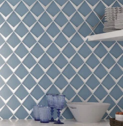 Marine blue frosted glass diamonds and gleaming chrome trim give this mermaid tile a richly colored Art Deco design! This stunning glass mosaic tile is made up of diamond tiles arranged on mesh in sheets measuring 12.1″ x 9.3″. The combination of vibrant color, matte glass, and shiny metallic finish is a stunning addition to your kitchen remodel for a colorful backsplash design or wall accent tile! These stunning glass tiles can be installed in any indoor wall location, from a fresh new bathroom wall design, living room accent wall, a beautiful shower wall tile in a bold blue color, or even an eye-catching colorful tiled fireplace surround to give your living room a fresh new look. This beautiful style is available in frosted White, Blush Pink, and Sage Green – the mesh-backed mosaic sheets are designed to interlock together for a seamless installation, or can be paired with other colors to create a decorative tiled wall!