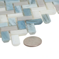 | Sold by: Sheet Sheet Size: 11.8″ x 11.9″ Chip Size: 0.4 x 0.9″ Width: 11.8 Length: 11.9 Thickness: 1/4″ Material: Glass Color: Gray, Blue, White Finish: Glossy Mounting type: Mesh Mounted Recommended Adhesive: Laticrete Glass Tile Adhesive Lite Packing info:
