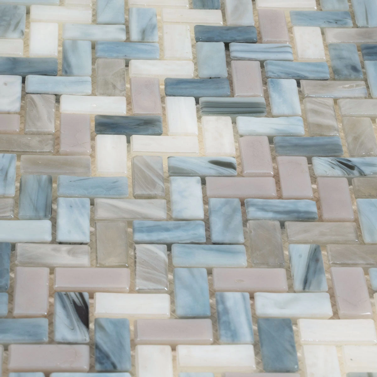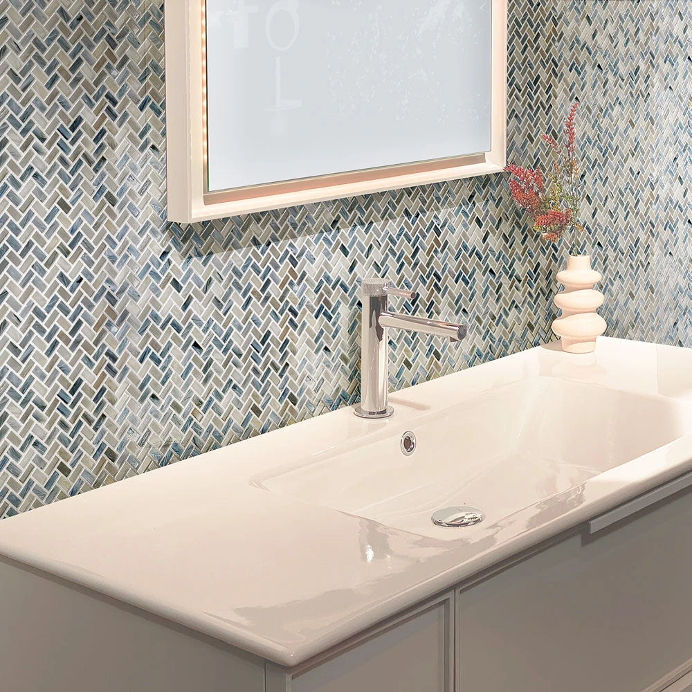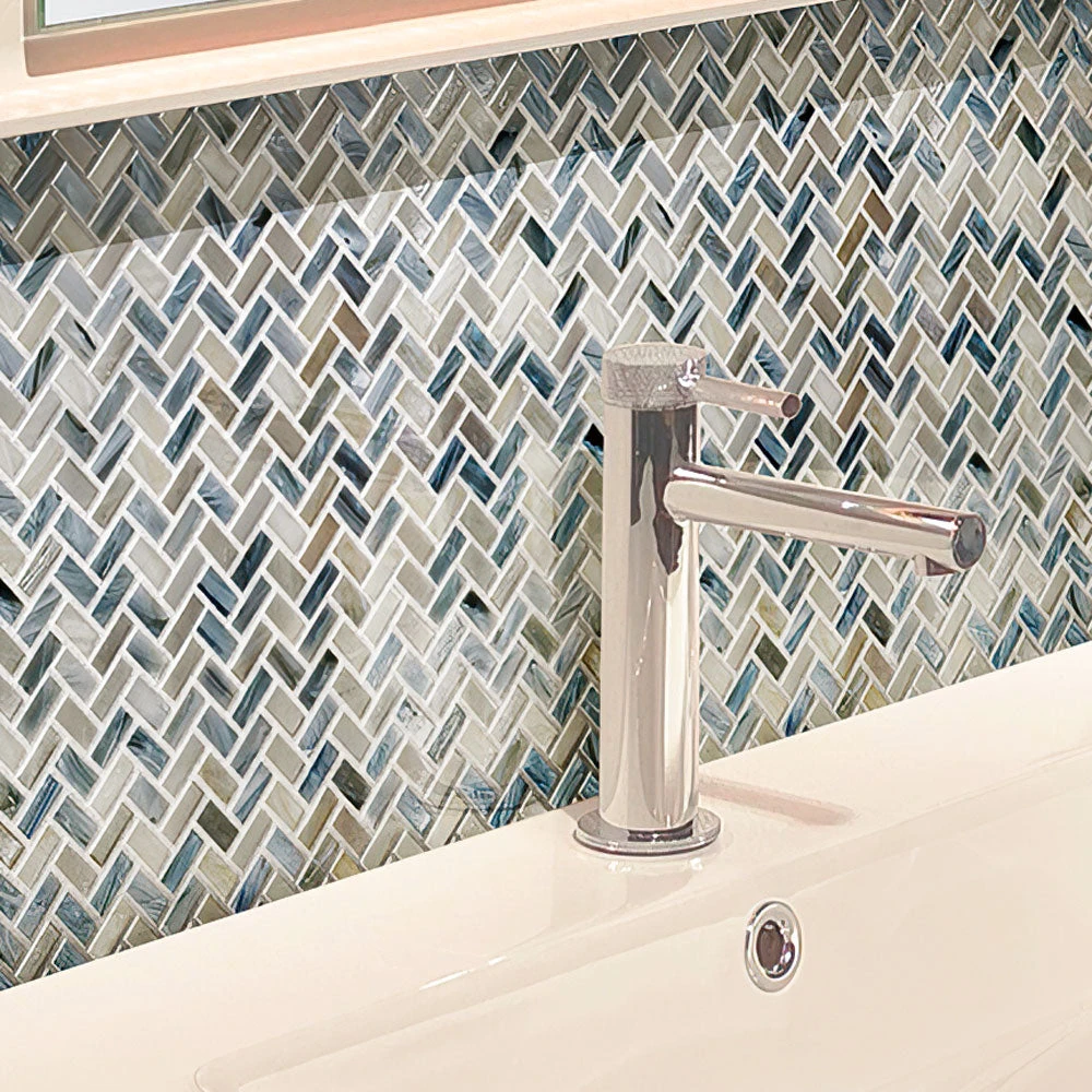 Be on top of modern trends with this blue and grey herringbone tile. A combination of blue grey tile colors fits any modern color scheme and sets a cloudy, romantic look. A timeless geometric form delivers a lively dynamic move that enlivens every space. A subtle gloss of a frosted mosaic finish brings a radiant glare to your ambiance. Each square tile sheet is attached to a mesh back for a simple and fast installation process. Glass tile is a well-known stain-resistant low maintenance product that can be used for numerous and commercial projects. Slip-resistant features make this grey herringbone tile one of the best pool tiles and steam room mosaics. Decorate your bathroom with blue and gray shower floors, walls, or a grey herringbone backsplash. Use it in your kitchen, living room, or hallway. These herringbone tiles will always be a stylish décor of any design.