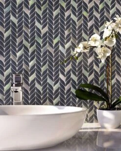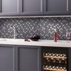 | Sold by: Sheet Sheet Size: 11.6″ x 12.1″ Chip Size: 0.6 x 2.4″/ 15 x 60 mm Thickness: 15/64″ Material: Recycled Glass Color: Deep Blue Grey Finish: Matte Mounting type: Mesh Mounted Recommended Adhesive: Laticrete Glass Tile Adhesive Lite | Area of use: