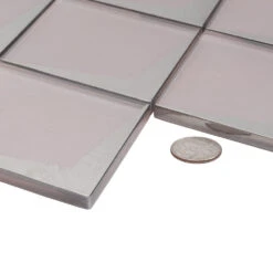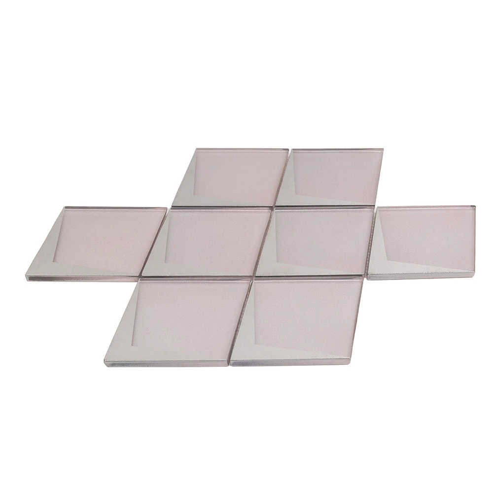 These pink glass mosaic tiles have a frosted finish that adds a beautiful contrast to the metallic chrome accent on one side of the diamond tile. Each sheet measures 12.1″ x 9.3″.