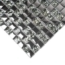 | Sold by: Sheet Sheet Size: 11.7″ x 11.7″ Chip Size: 0.6” x 0.6” Width: 11.7 Length: 11.7 Thickness: “5/16” Material: Glass Color: Silver Finish: Glossy Mounting type: Mesh Mounted Recommended Adhesive: Laticrete Glass Tile Adhesive Lite Packing info: