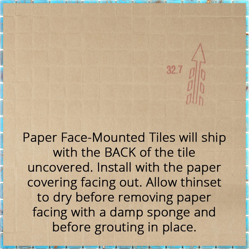 | Sold by: Sheet Sheet Size: 12” x 12″ Thickness: 1/4″ Chip size: 20 x 20 mm Mounting: Paper Facing Material: Glass Color: Black, Blue Recommended Adhesive: Laticrete Glass Tile Adhesive Lite Packing info: