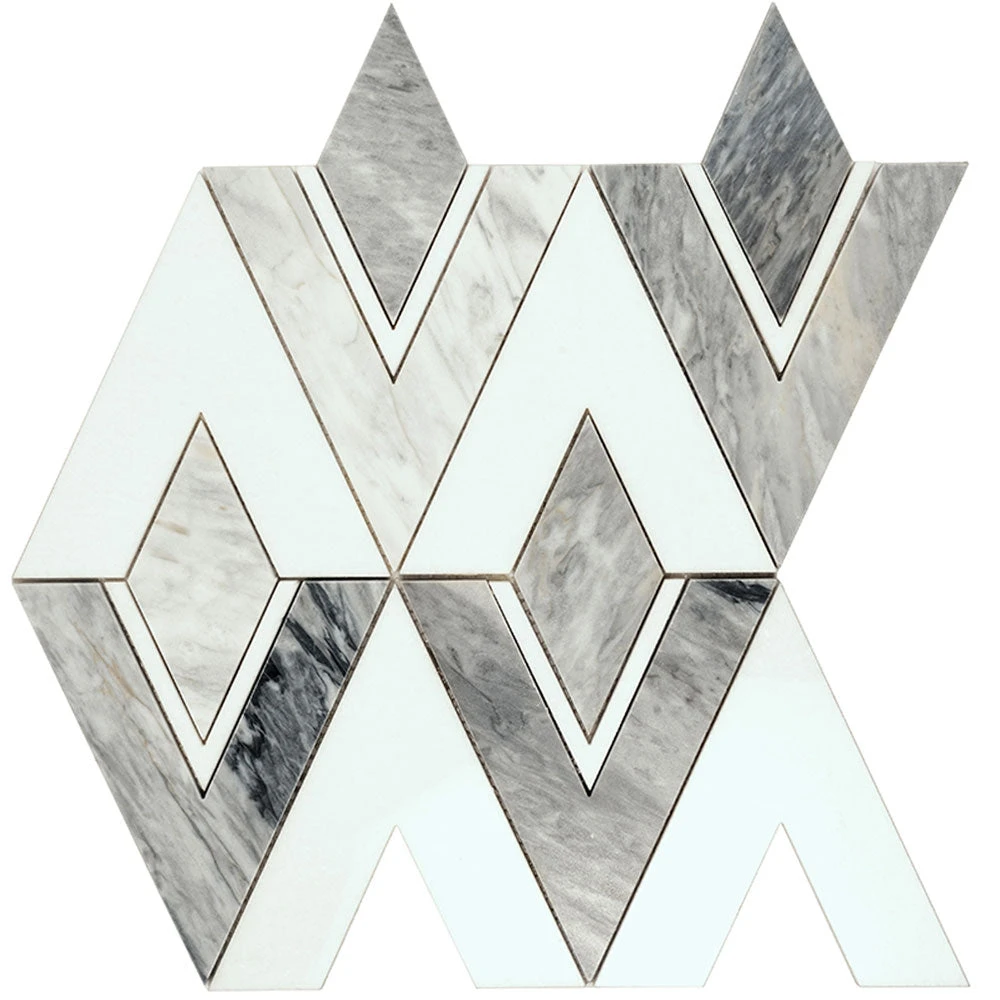 | Sold by: Sheet Sheet Size: 11.2 x 11.9″ Chip Size: 5.5 x 11.8″ Chip size mm: 140×300 Width: 11.2 Length: 12.0 Material: Calacatta Bluette, Thassos White Thickness: 3/8″ Color: White, Gray Finish: Polished Mounting type: Mesh Mounted Packing info:
