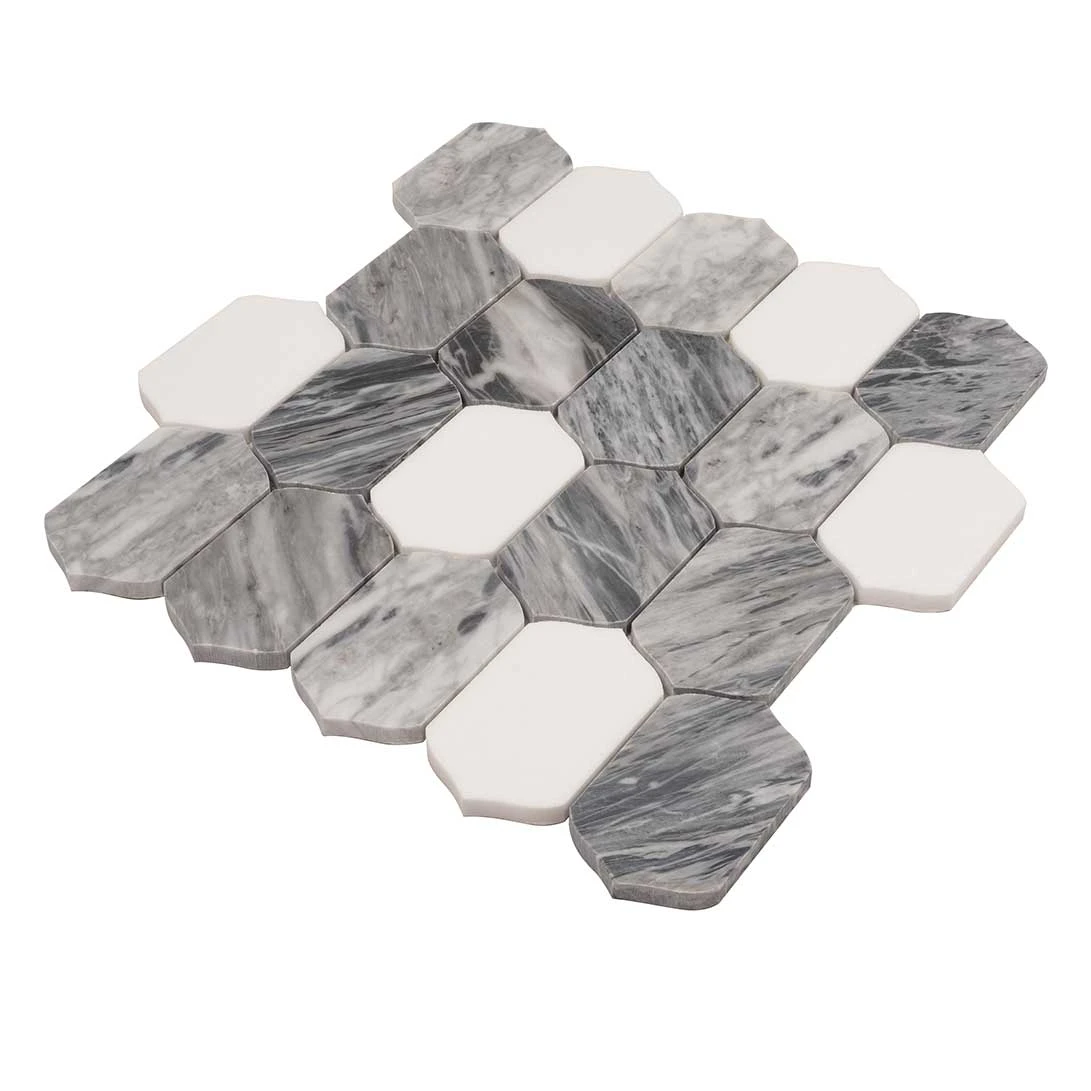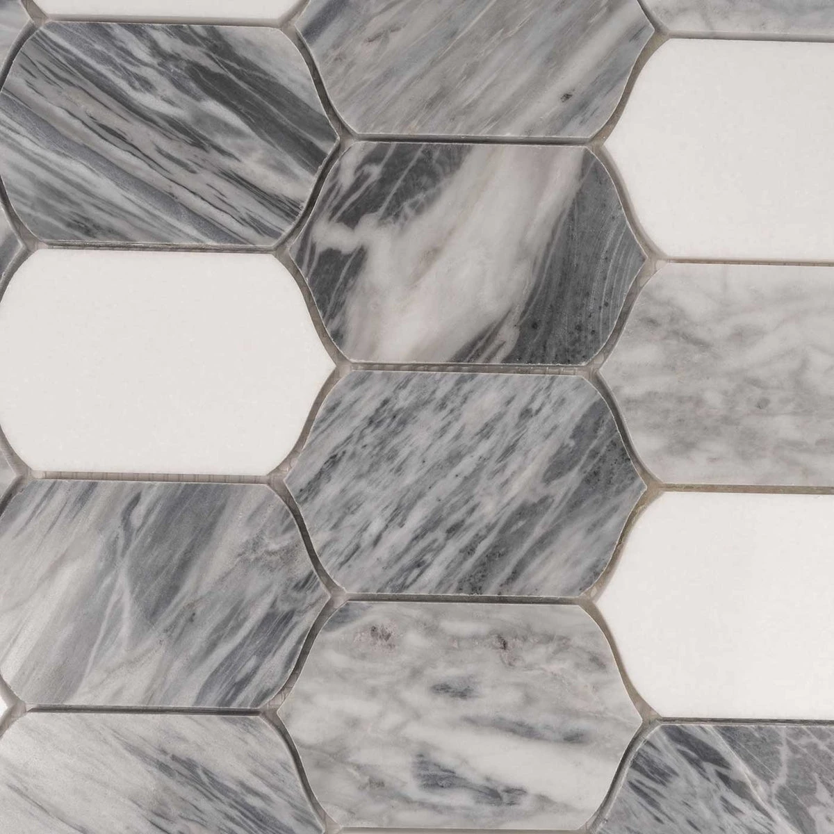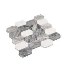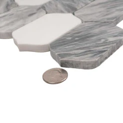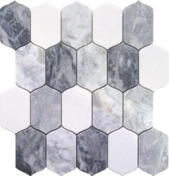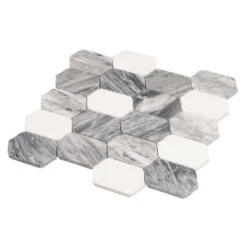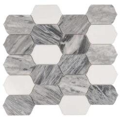 | Sold by: Sheet Sheet Size: 13.2×12.2″ Chip Size: 1.2 x 4.2″+0.5 x 4.2″ Width: 13.2 Length: 12.2 Material: Calacatta Bluette, Thassos White Thickness: 3/8″ Color: White, Gray Finish: Polished Mounting type: Mesh Mounted Packing info: