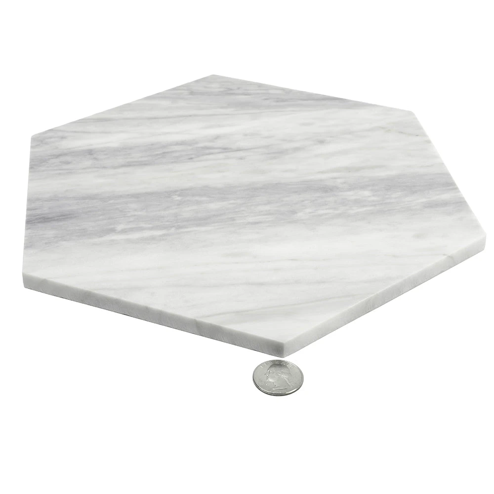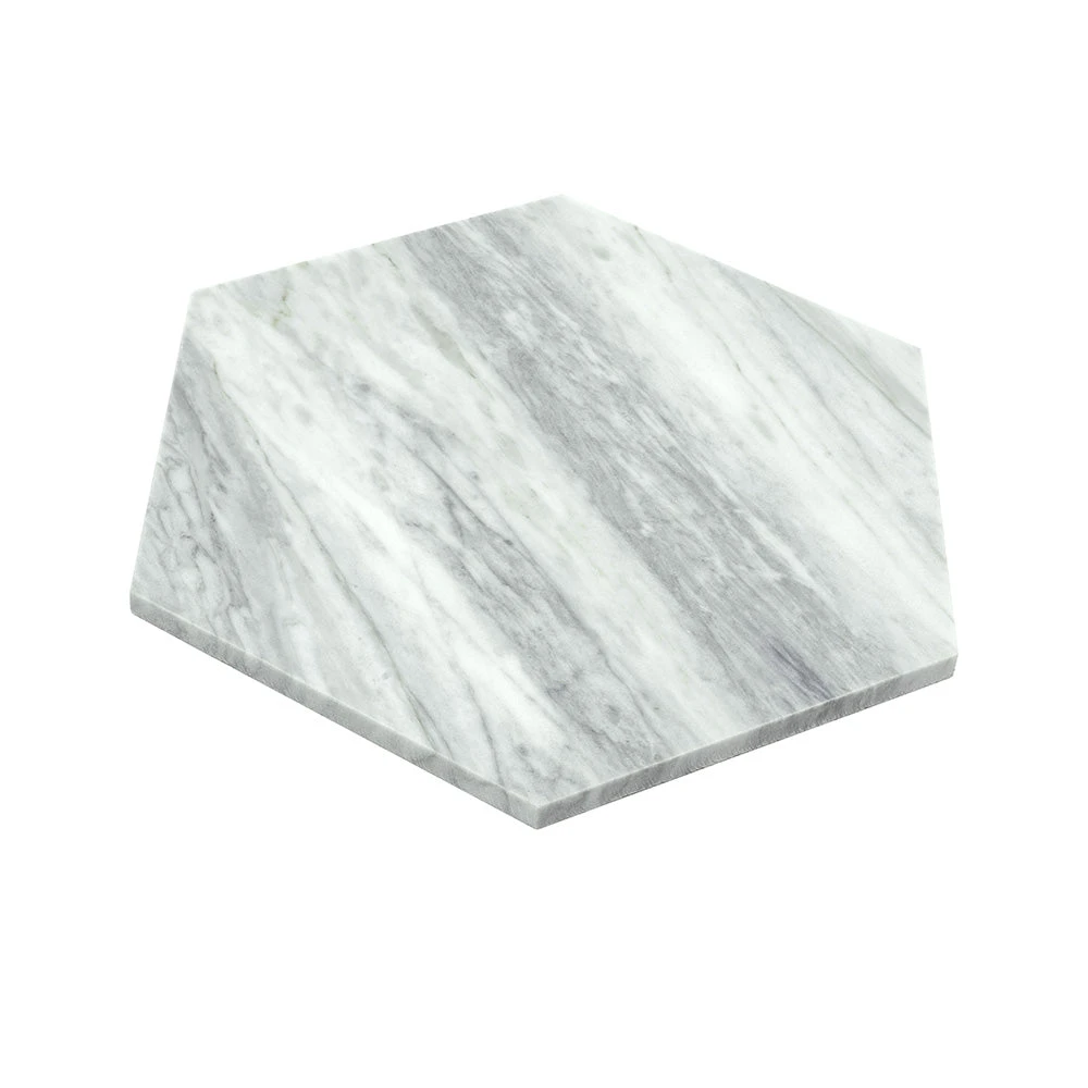 This marble field tile is pure Calacatta Bluette so you can expect tones of smoky white immersed in light gray with magical blue veining running through the stone. Expect considerable variation between tiles which is part of the beauty of investing in these marble tiles because you get to admire a variety of organic veining. The hexagonal geometric-shaped tile is widely preferred for creating visual depth in a space as well as creating a transition between decor styles in different parts of the home. The neutral and chic color scheme plays into this concept so you can experiment with interior design without confining yourself to one era; for example these marble tiles can be used for a combined boho-chic and art deco design moment in any room or bathroom. Use this marble field tile to create an impression outside the home as well whether you’re covering your outdoor patio, balcony, sitting area, or sunbathing nook.
