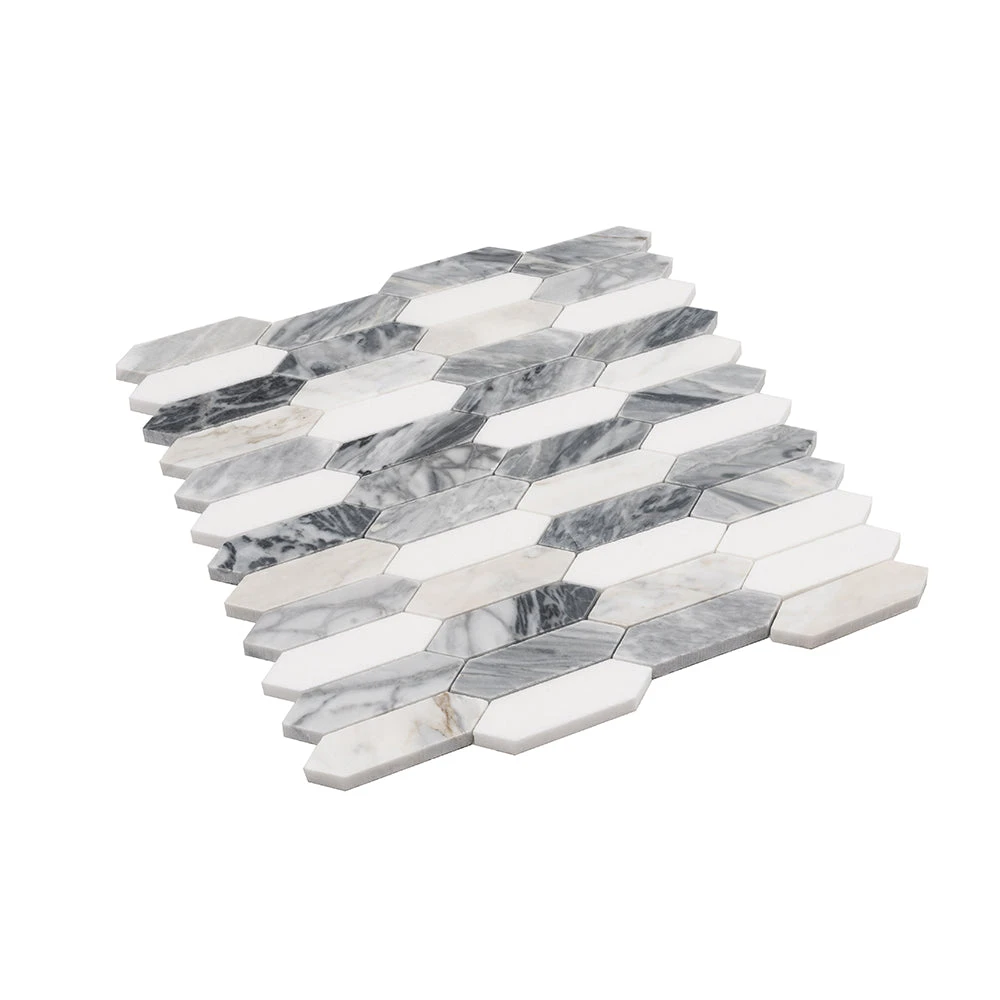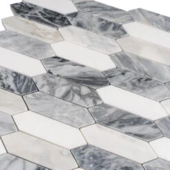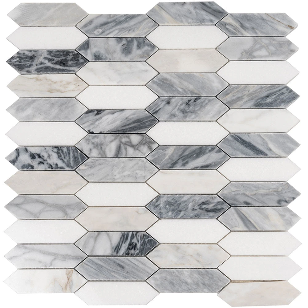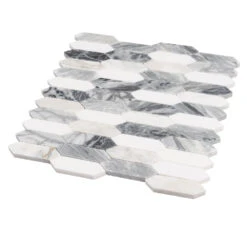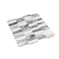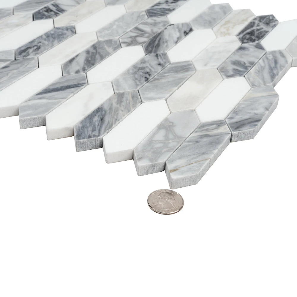 | Sold by: Sheet Sheet Size: 12.2 x 11.6″ Width: 12.2 Length: 11.6 Material: Calacatta Bluette, Thassos White Thickness: 3/8″ Color: White, Gray Finish: Polished Mounting type: Mesh Mounted Packing info: