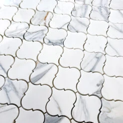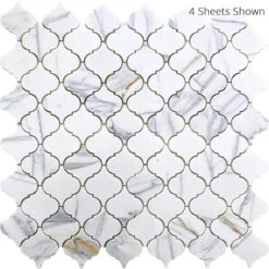 Each sheet measures approximately 11.2″ x 11.2″ and can be laid side by side with other marble mosaic tile sheets to continue the arabesque pattern and create a continuous design behind your stove, under your cabinets, and cover your entire wall or floor! This Calacatta lantern tile is suitable for many indoor and outdoor applications. It is an incredible option for tile floors, including shower tile floors. Rich and sophisticated, these beautiful tile designs create marvelous tile accents in any shower, bathroom, or beyond. Accent your home with a gorgeous white and grey backsplash or an alluring tiled fireplace surround. Our Calacatta arabesque tile pairs well with white cabinetry and flooring, or you can install it along with marble to achieve a more eclectic look.