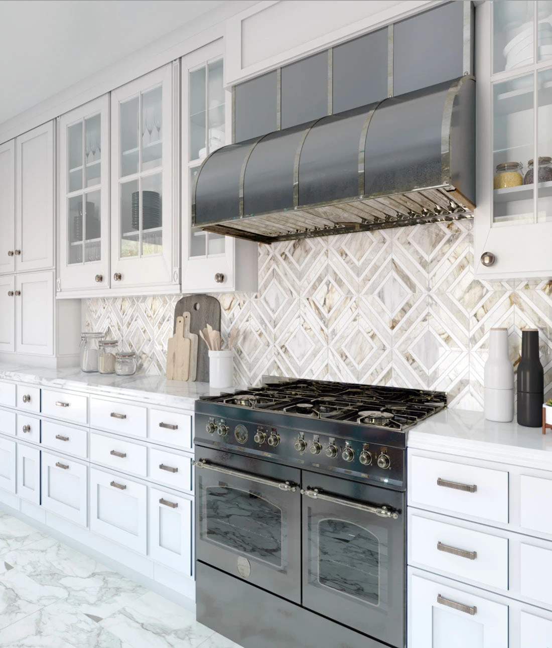 See it in a kitchen by Tile Club Platinum Pro member, Outside In Living, who used this beautiful diamond marble patterned tile as a focal point behind the stove when designing this kitchen makeover. They paired it with our Beveled Calactta Marble subway tile under the cabinets to create a beautiful mix and match tile design that complemented each other and the bold green kitchen cabinets.