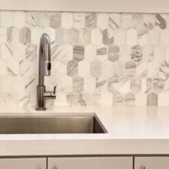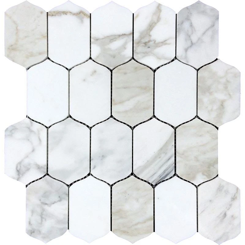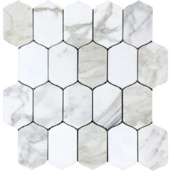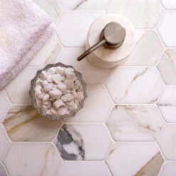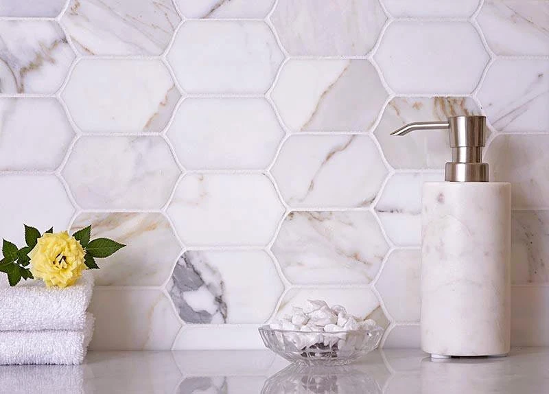 Elevate your design with our mosaic tile made of precious Italian Calacatta Gold marble. With its eternal, distinguished appearance, Calacatta Gold has always been the choice of kings in the ancient world for its strength and beauty. Its classic look harkens back to ancient times but it’s not stuck in centuries past. Because of its timeless charm, today Calacatta Gold tile is one of the most sought-after stones for home décor and an elegant addition to any space. It’s hard to go wrong when using Calacatta Gold tiles in your space. This mosaic tile exhibits the graceful veining patterns of gold and grey across a backdrop of milky white in a hexagon-like pattern. Though you can combine these tiles with almost any color, we recommend pairing them with warmer paint and cabinetry colors to bring more attention to its veining pattern. These tiles can be used anywhere from entryways to bathrooms, kitchens to living rooms as your flooring or backsplash tile. For a dramatic look, pair them with dark grout colors such as a charcoal gray, to make the shape of the tiles pop.