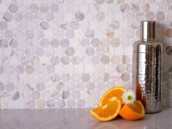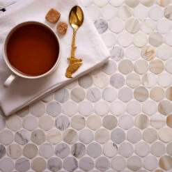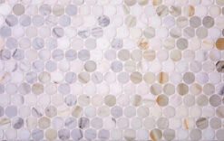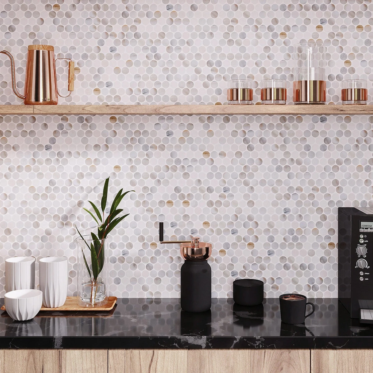 Beloved for their old-fashioned charm, penny round mosaic tiles are appreciated for floors that are uniquely patterned and boldly expressive. This mosaic tile brings the retro vibes of penny tiles with the classic beauty of Italian Calacatta Gold marble in a honed finish. Penny round shower tiles are still the most popular use, though putting them on the shower wall or niche also feels fresh and new. While only one tiled wall can serve as an accent feature, you can also have a full-shower coverage with penny tiles for a more luxe feeling. But the idea that penny tiles have to be in the bathroom isn’t true anymore. The always charming penny round in elegant Calacatta Gold marble proves that penny tiles can go anywhere; in the kitchen, bathroom, laundry room, mudroom, or even staircases. If you want to give your kitchen a modern yet retro feel, try penny tile as your kitchen backsplash. Looking to create a floor for wet or high-traffic areas? Install honed penny tiles anywhere slip-resistance is required.