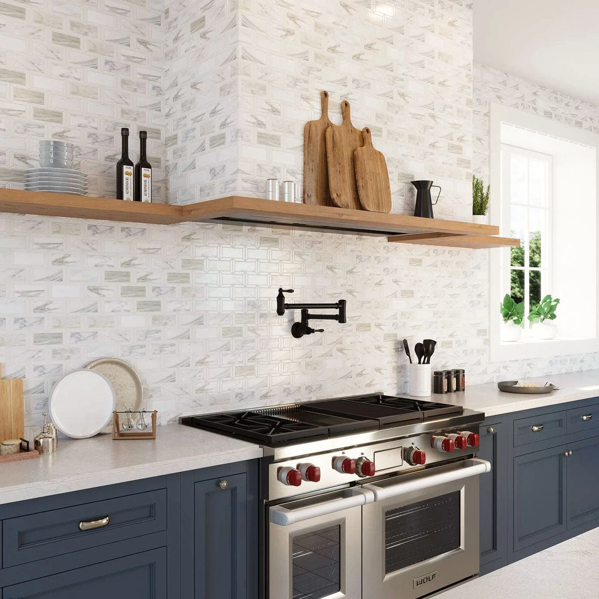 Calacatta Gold and Thassos meet in this mosaic tile to bring the natural beauty of marble in classic subway format. Whether used alone or as a decorative border, These mosaic tiles can be installed as your backsplash or floor tile. Unlike any other tiles, subway tile can withstand the test of time wherever installed. If you want to pack on the color and add timeless beauty, these marble subway tiles can act as an anchor for the rest of the room. The neutral color of the marble allows these tiles to bode well with colorful cabinets or hardware and can look good in almost any setting. White subway tiles can also make your dark cabinetry pop and brighten up your kitchen or bathroom. Both the veining and the tile shape of this mosaic tile creates a look that is forever in fashion.