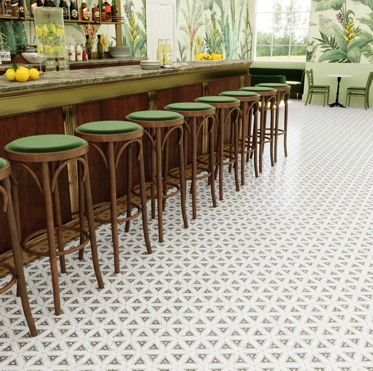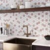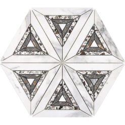 This beautiful combination of Calacatta Marble and Terrazzo detailing boasts a unique kaleidoscope tile pattern that is sure to turn heads! Create a stunning feature wall in your master bathroom, jazz up your entryway flooring, or install as your kitchen backsplash for the style of your dreams. This unique patterned tile is such a beauty in person – order a sample today to see for yourself! As always, samples have free shipping.