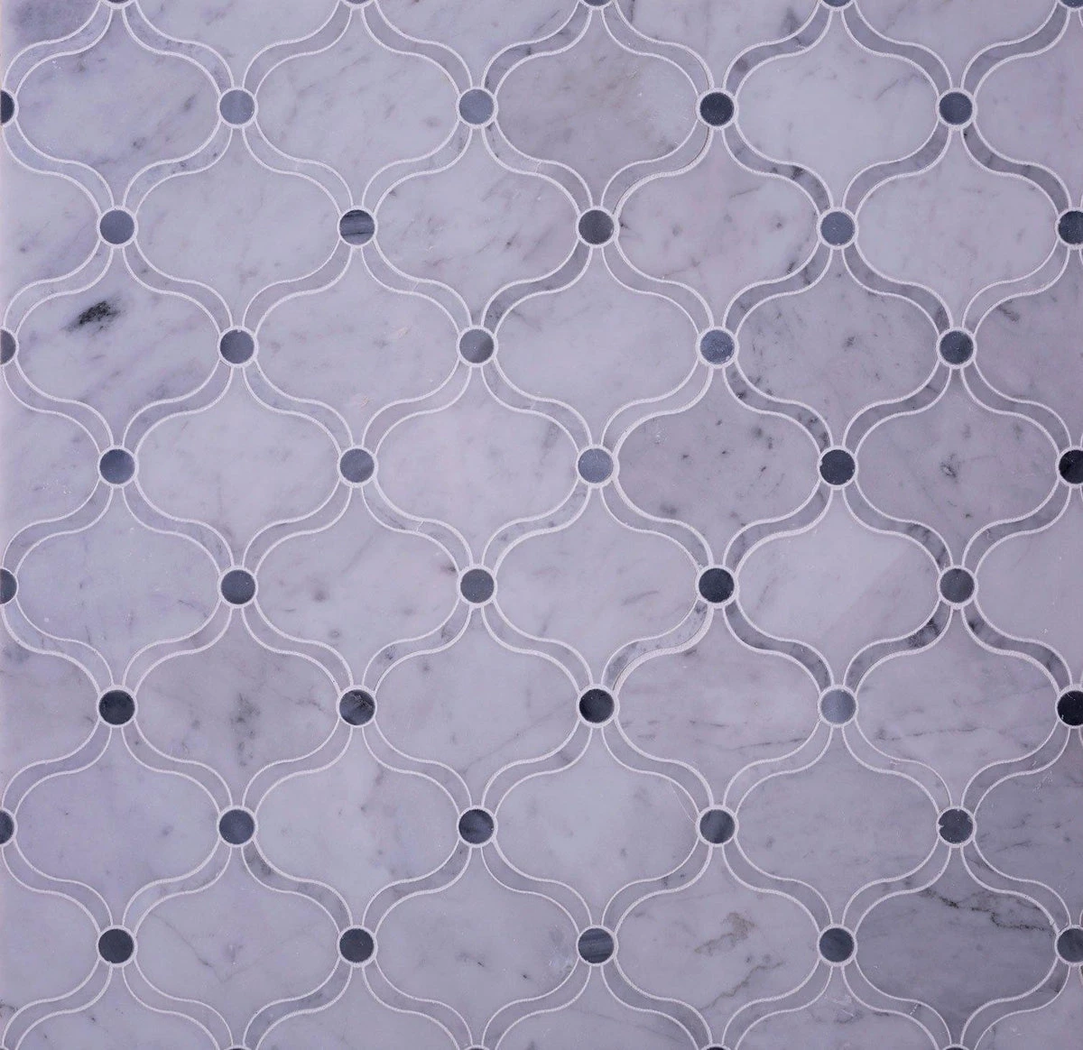 Emphasize your home design with our Carrara marble mosaic tiles. This classic grey marble tile look is highlighted with a timeless arabesque pattern. Playful dark dots create a lively modern feel that will enliven any interior or exterior design. The glossy finish leaves a glamorous shine which is absolutely stunning in natural or reflective lighting. If you want to add a touch of luxury to your home Carrara Marble Arabesque tiles are the perfect way to do just that. This tile design has been used in homes for centuries and will continue to be a staple in interior design. You’ll love how these beautiful pieces look with any style of home decor from modern minimalism to classic traditional styles.