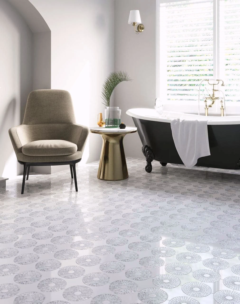 These micro mosaic tiles made of marble are a great choice for a slip-resistant floor in your bathroom, entryway, mudroom, or other areas exposed to water and damp! The decorative tile pattern made of the circle inlay designs adds a fun, yet classic, detail to a kitchen backsplash, mudroom wall, or creative fireplace!