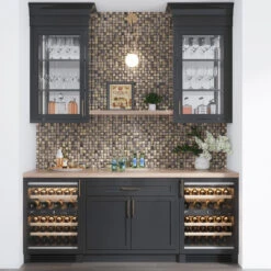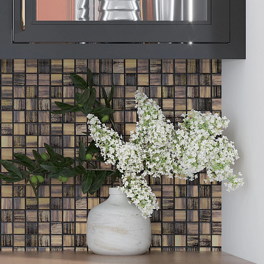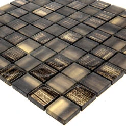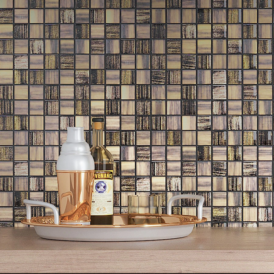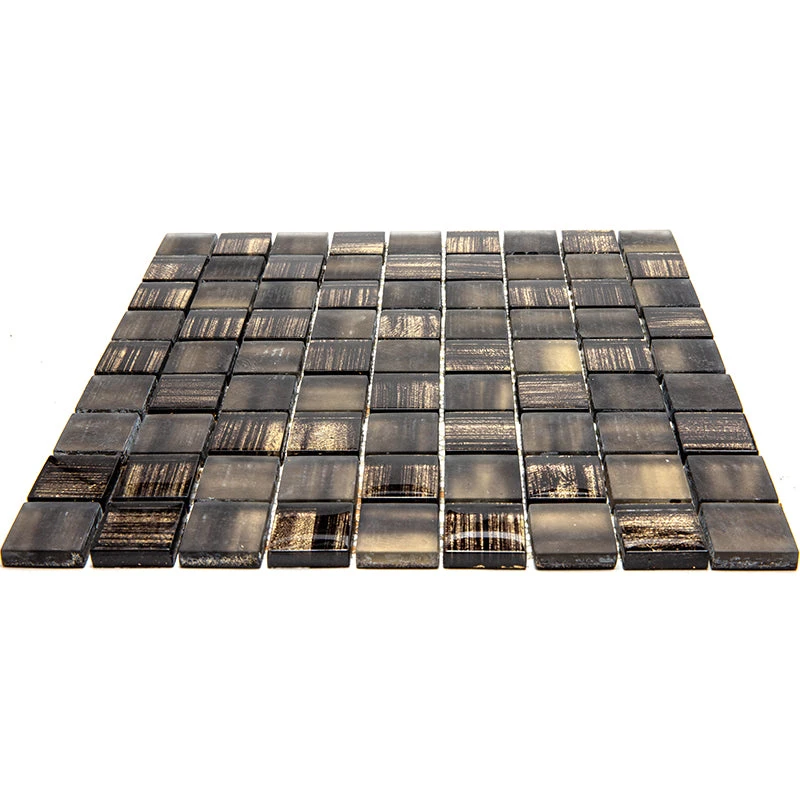 Charcoal Foil square tile is an excellent solution for those who prefer a fine elegant look. Mixed matte and black glass pieces create a mysterious jazzy feel in your space, and a subtle gold foil brings out the fancy character of this glass mosaic tile.
