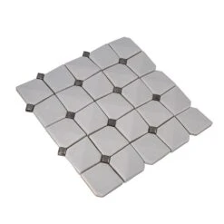 | Sold by: Sheet Sheet Size: 12″ x 12″ Width: 12″ Length: 12″ Chip Size: 0.6 x 0.6 + 2.4 x 2.4″ Chip size mm: 60 x 60 + 15 x 15 Thickness: 5/16″ Material: Ceramic Color: Gray/White Finish: Glossy Mounting type: Mesh Mounted Packing info: