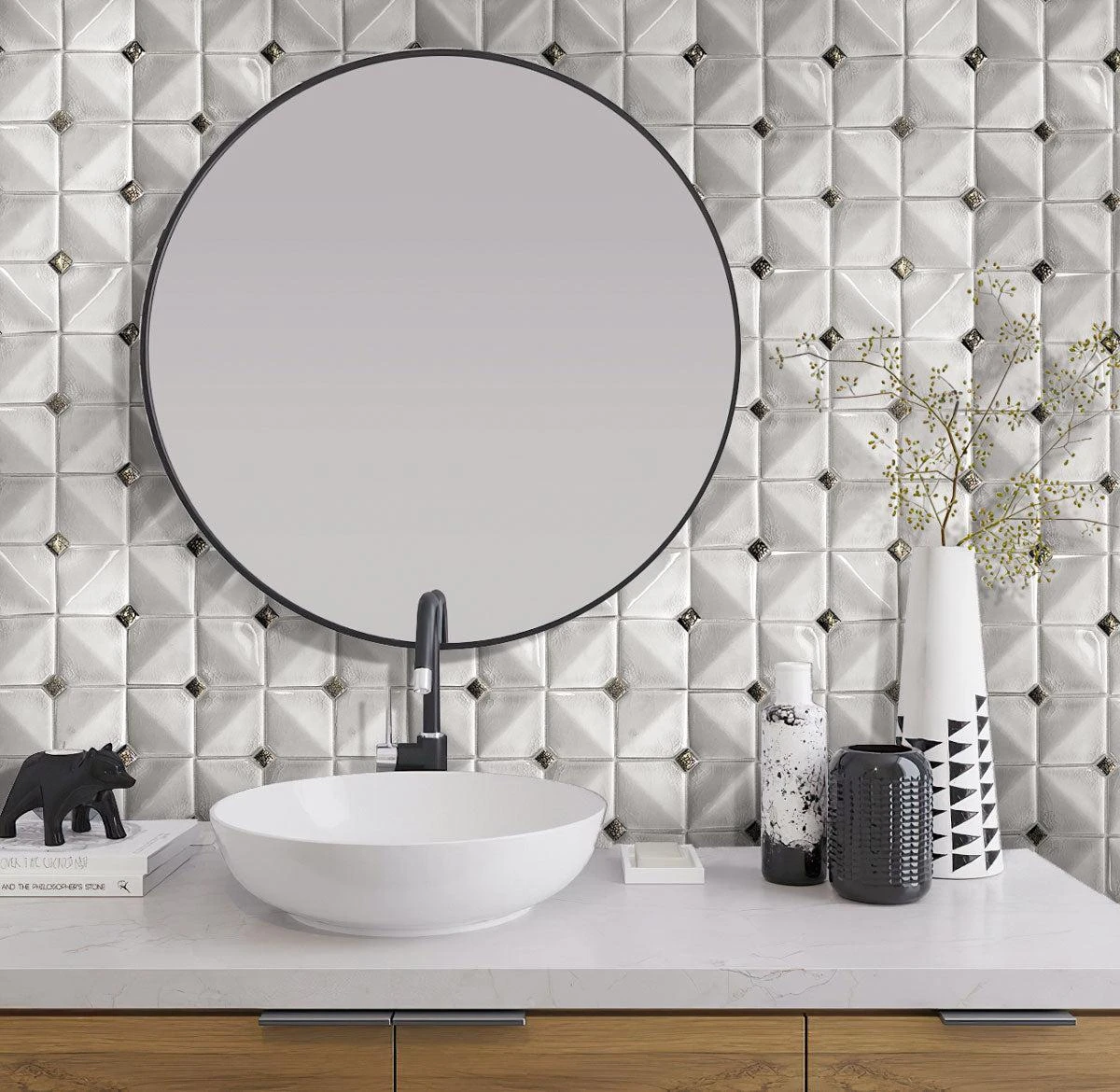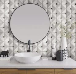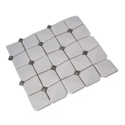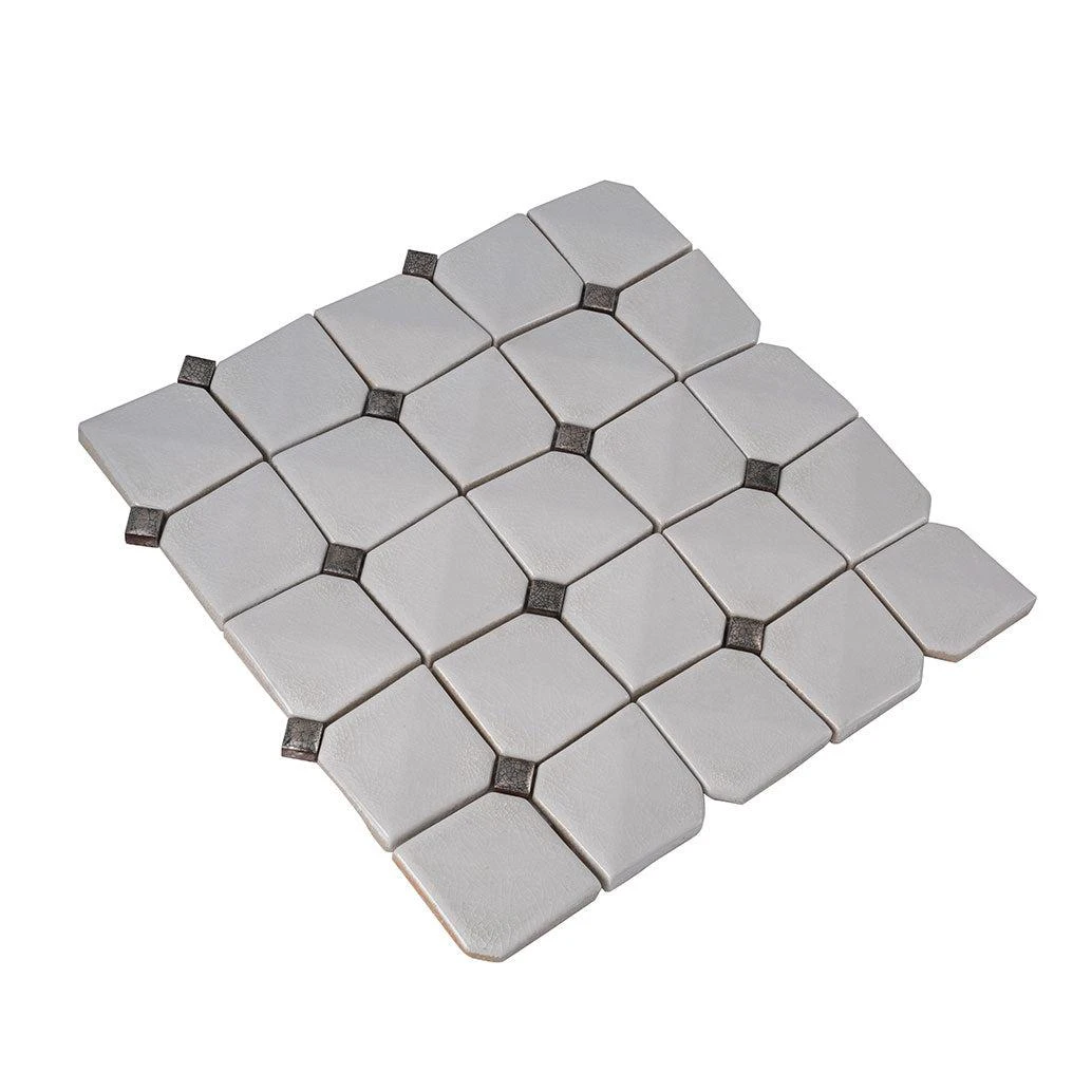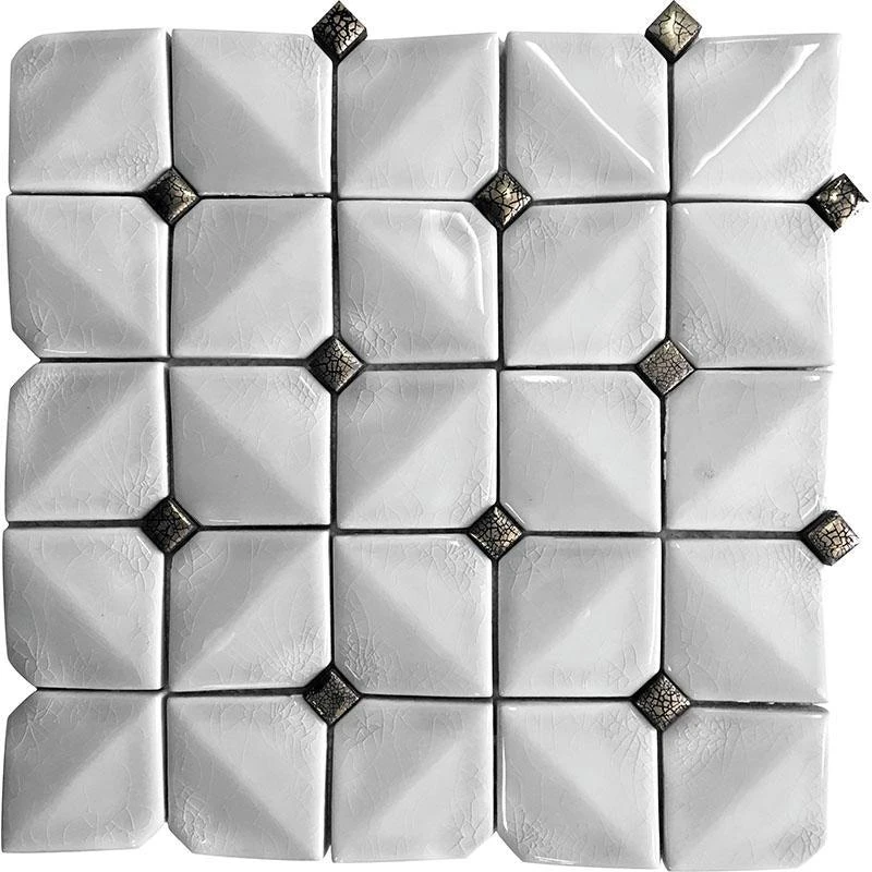 This decorative white ceramic tile is the perfect way to dress up a traditional interior! The subtle 3D look of this mosaic tile allows light to play across the crackled ceramic surface, while the white and gray palette is a gorgeous fit for any home decor style. These diamond-patterned white ceramic tiles are a gorgeous fit for a French Country kitchen backsplash, a creative fireplace facing to acccent your living room design, an elegant bathroom wall, or a stunning shower detail!