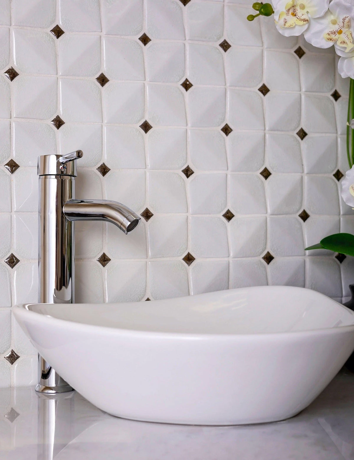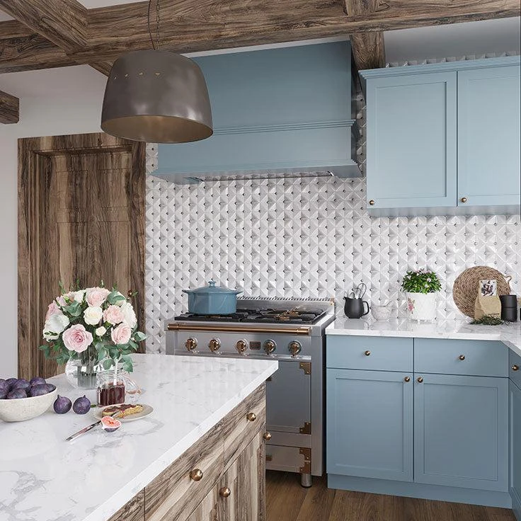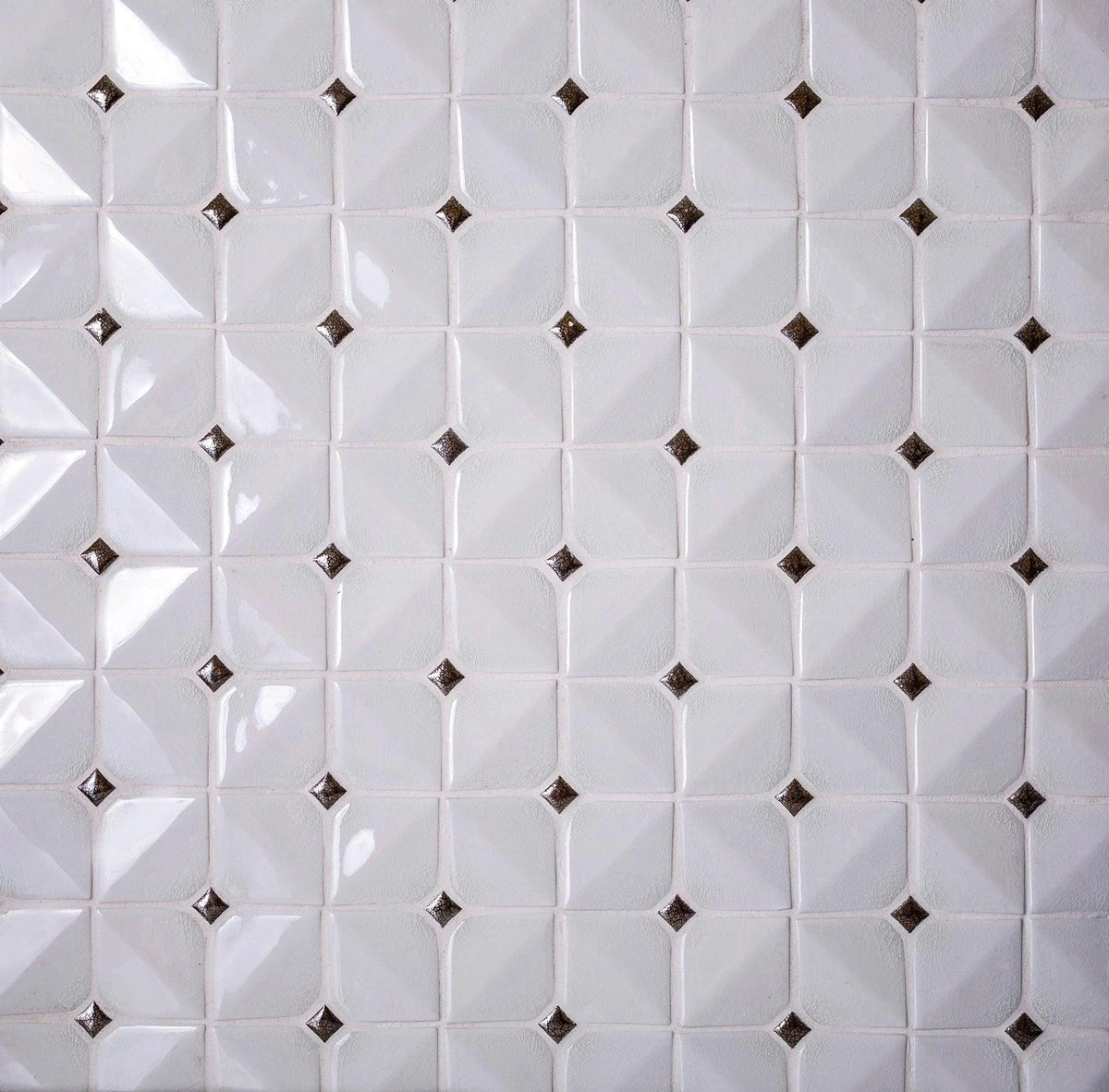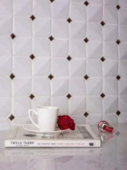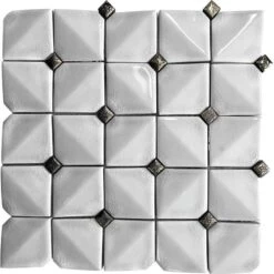 This glazed white square tile is easy to wipe clean and has a subtle dimensional design that adds texture and depth along with the beautiful mosaic pattern.