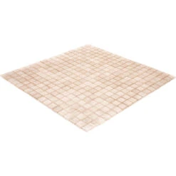 | Sold by: sheet Sheet Size: 11.6″ x 11.6″ Chip Size: 0.6×0.6″ Thickness: 1/4″ Mounting: Paper Facing Material: Glass Color: Clear with a peach sheen Recommended Adhesive: Laticrete Glass Tile Adhesive Lite Packing info: