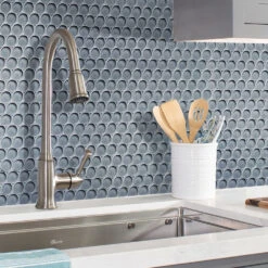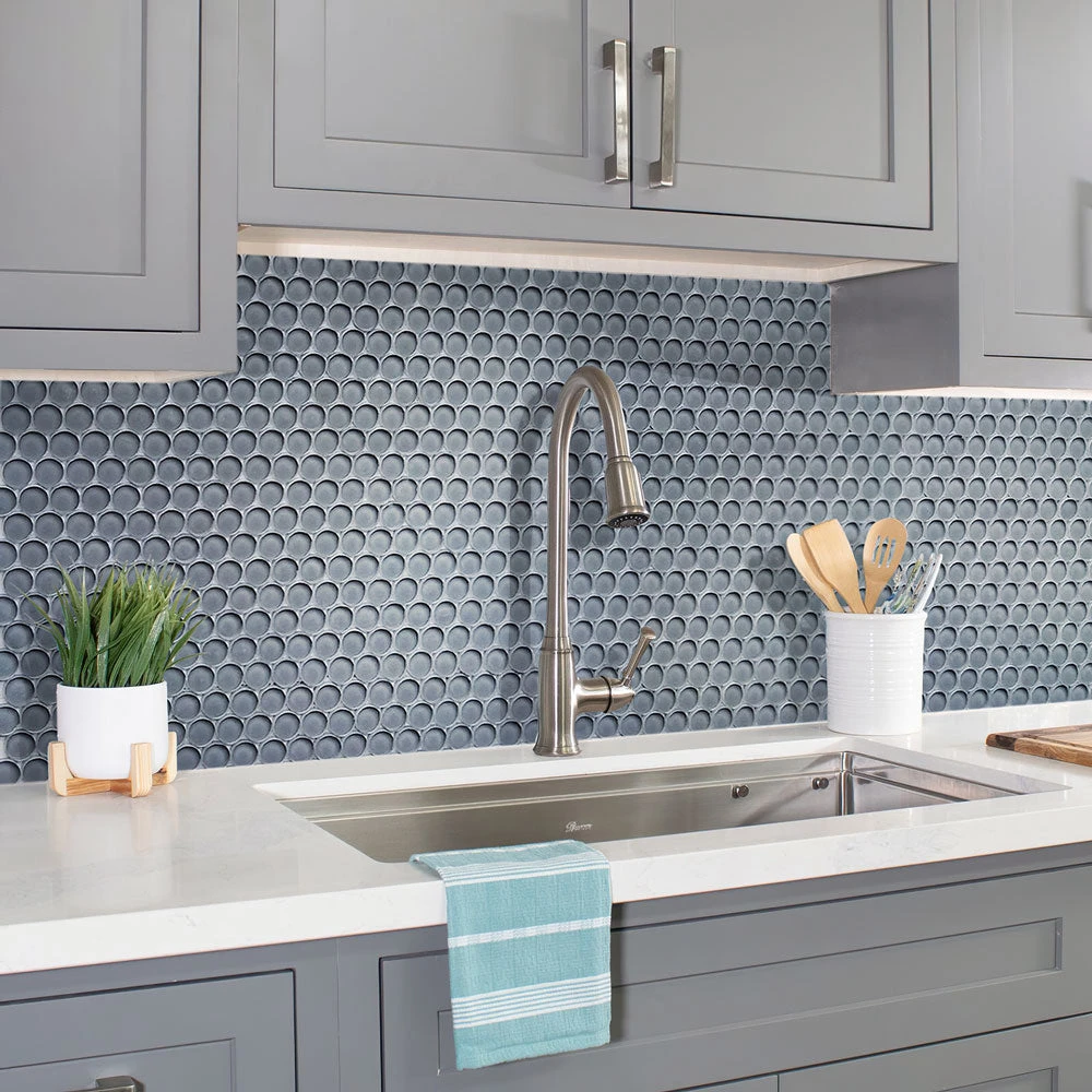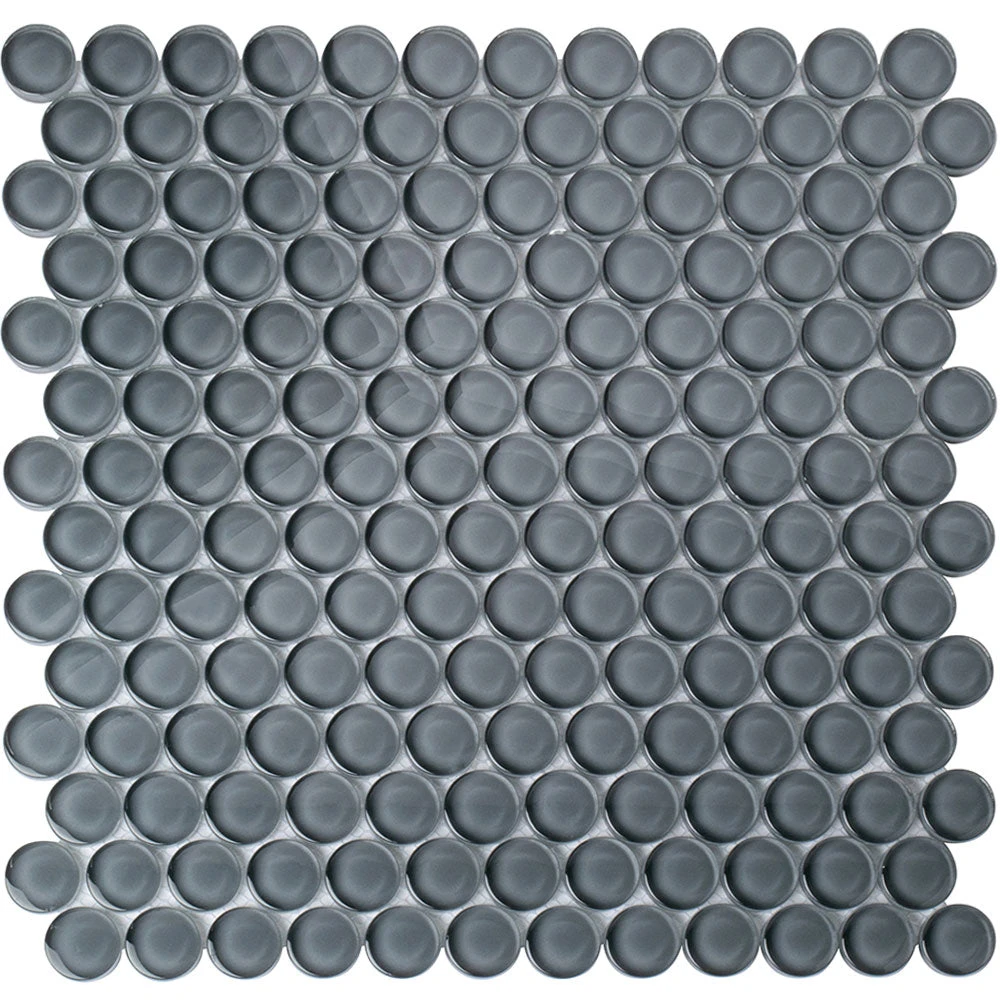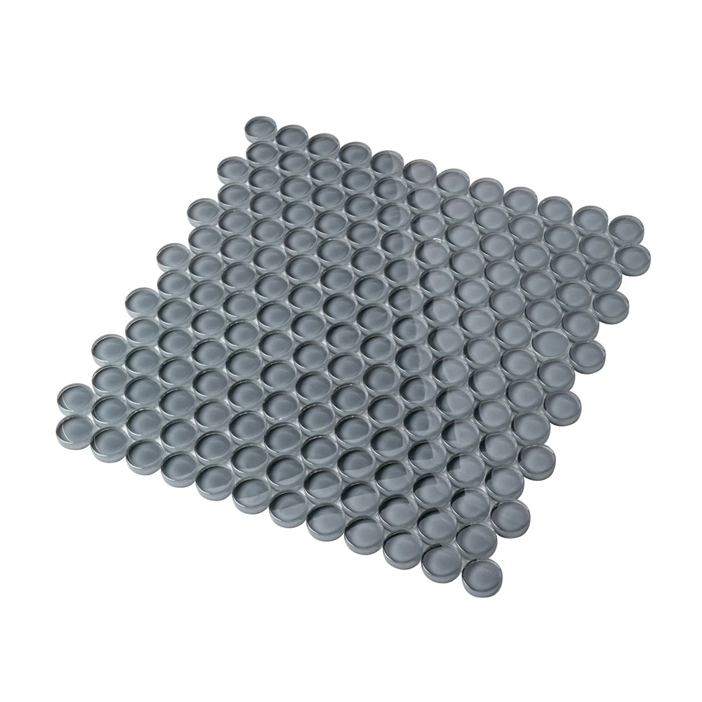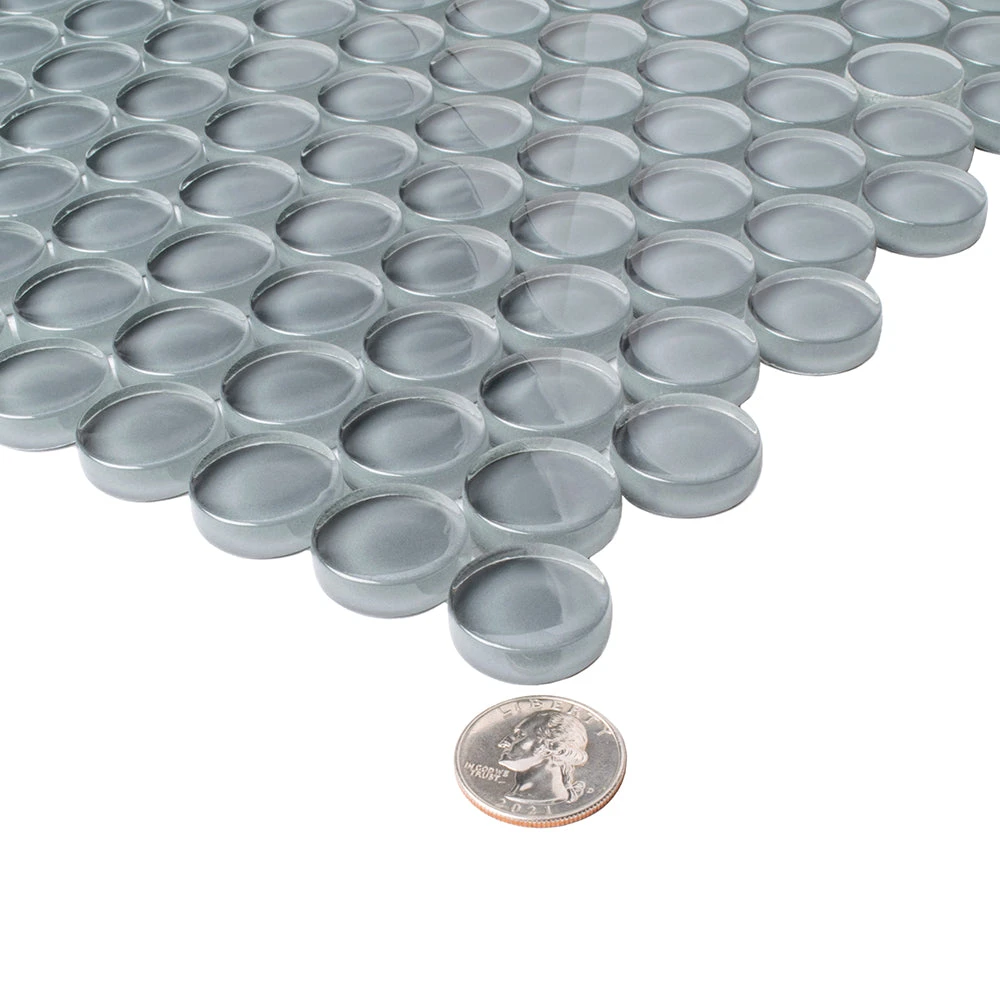 Our Cool Gray Glass Penny Round Tile is the perfect way to add a metallic shimmer to any surface you want to show. If you think that your interior design is to blend, add some playful light tricks to the room and enjoy this unique glamorous look. Cool gray glass mosaics will emphasize the modern style of your area and will bring an airy spacious feel. Square mosaic sheets and a mesh back save your time and efforts during the installation. Despite the gentle look, this glass tile is sturdy enough to cover low traffic floors and fireplace surrounds. Use it for a bold penny-round backsplash, a feature wall, niche, mirror frame or any other focal point. No matter how you infuse it in your design, this cool gray penny round glass tile will brighten up your bathroom, kitchen or any interior design you want.