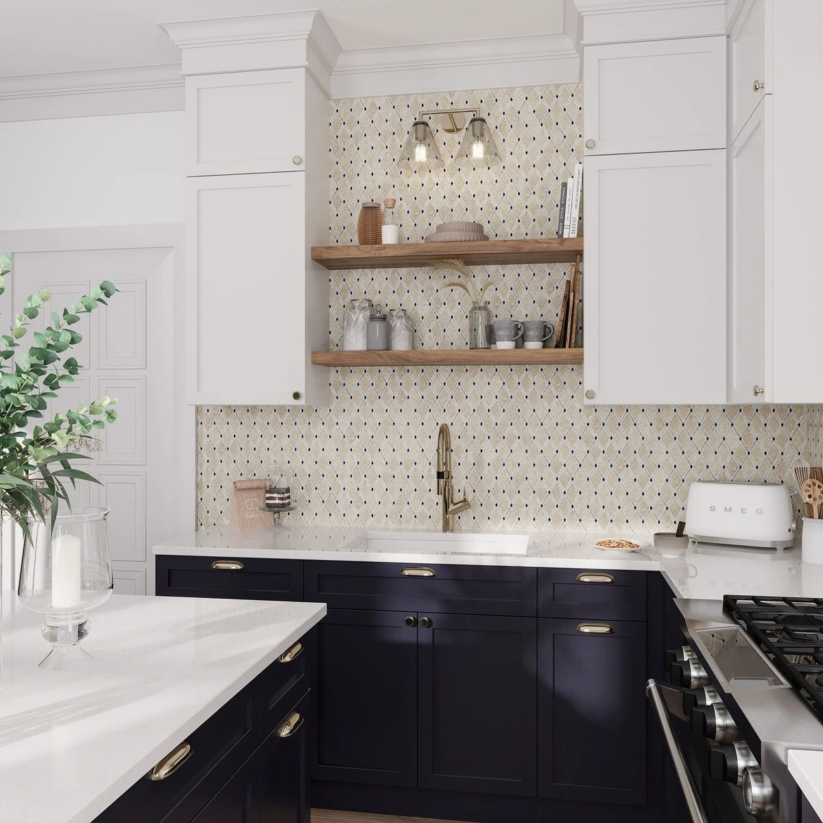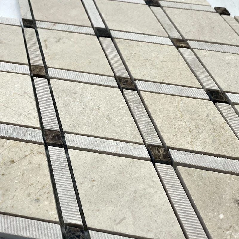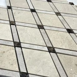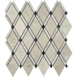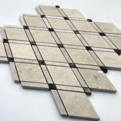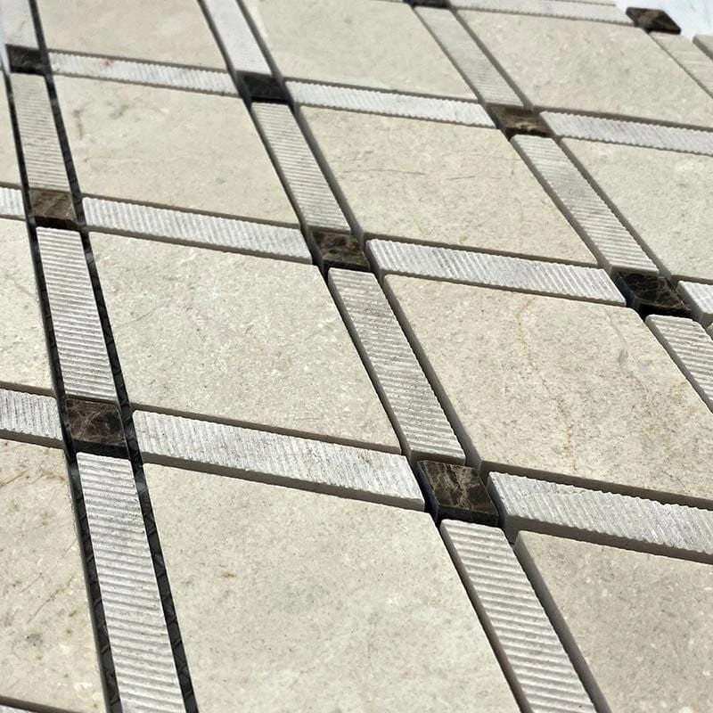 How perfect is the diamond pattern made of Crema Marfil in this beautiful tile! The subtle color variation and etched pattern on the lines is a beautiful way to design with a diamond pattern tile while keeping the tones neutral and natural to complement any interior design. Whether it’s an eye-catching kitchen backsplash or a glamorous bathroom installation, this creative diamond tile is one of the most beautiful ways to include a timeless pattern in your home decor.