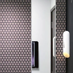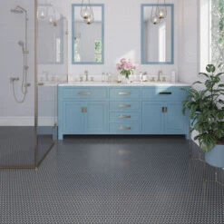 For a modern, masculine penny tile bathroom you can’t go wrong with these dark gray penny round tiles. They can be used by anyone looking for a simple, neutral metallic statement that matches with accents in any other color. Consider a penny tile shower floor with these gorgeous mosaic tiles or an entire shower and bath area if you are trying to create contrast with tiles of another color. They are equally stunning in the kitchen or dining area where you can do a gorgeous penny tile backsplash, contrasting them against sleek all-white cabinets with some metal decor items like mugs, vases or fixtures. The versatile gray color is easy to design decor around it without the end result being too overpowering.