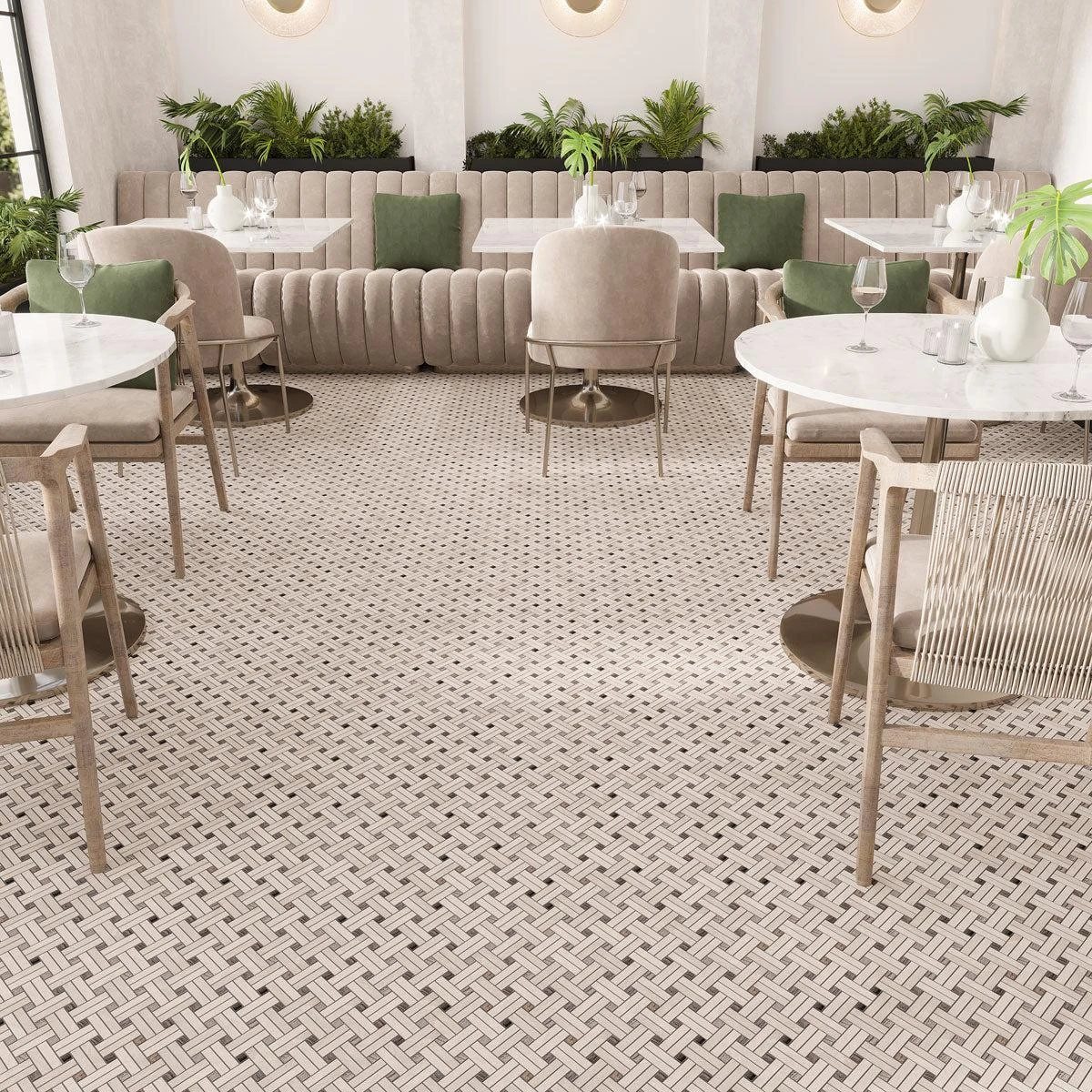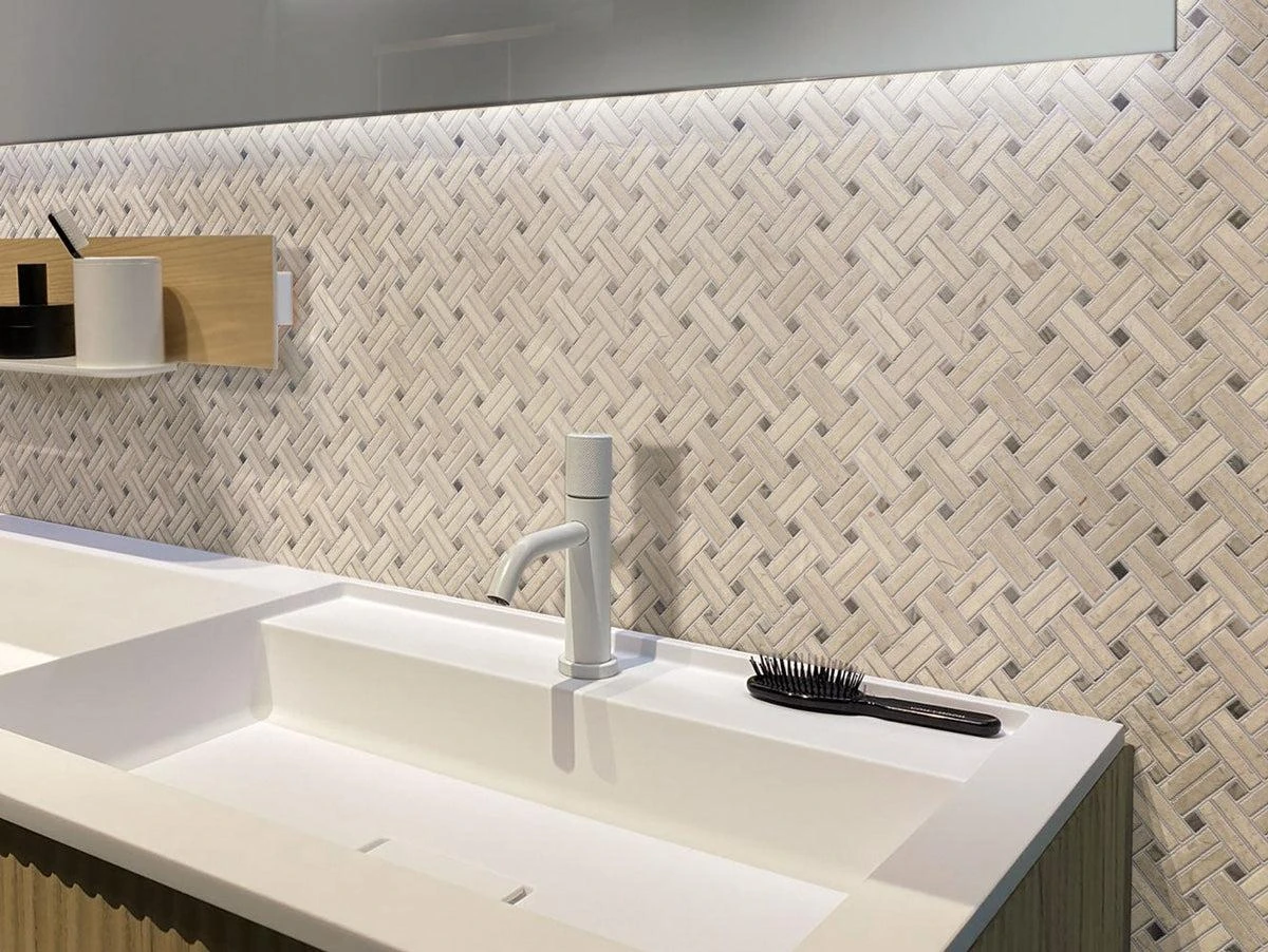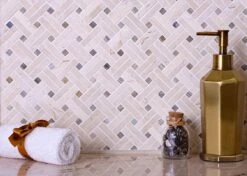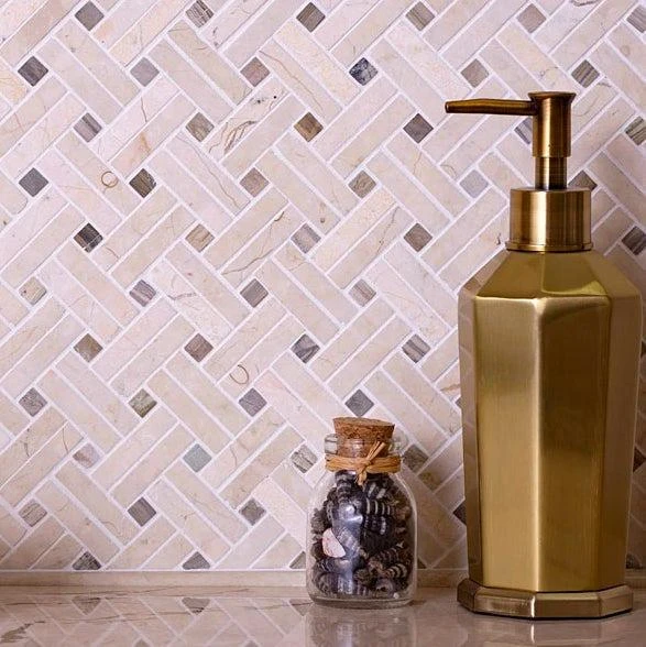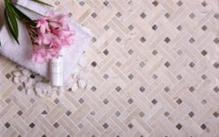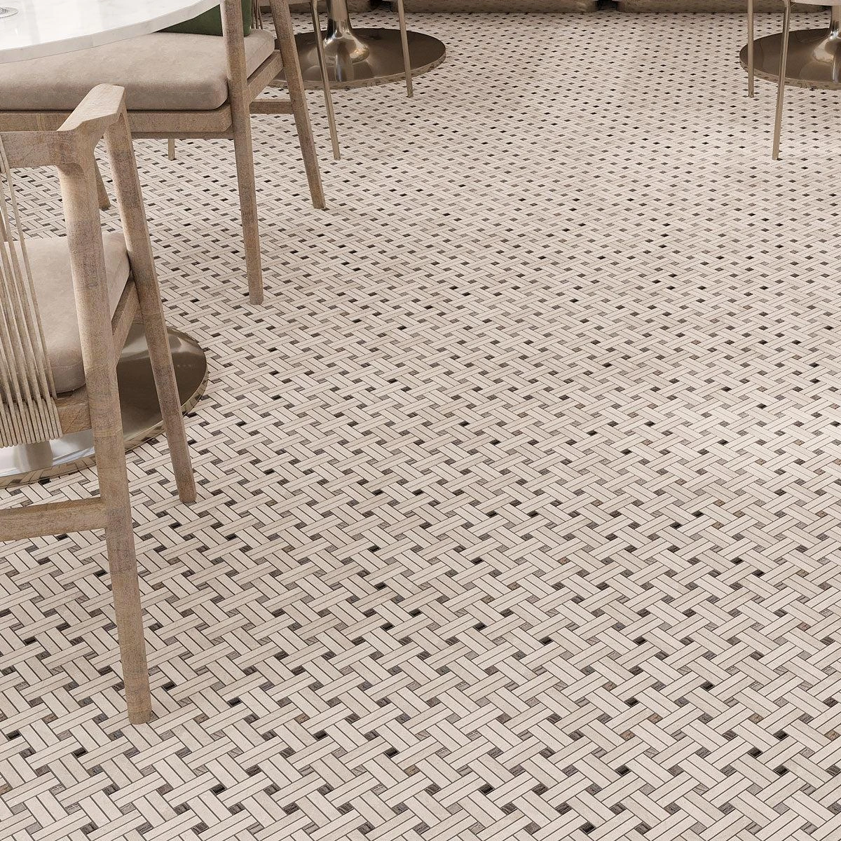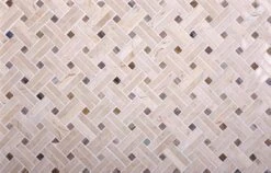Basketweave mosaic tile is a great opportunity to showcase your personal style and add dimension to the surface. Rectangles are laid in horizontal and vertical ways onto the sheet interlocking with one another for a seamless pattern. This diagonal basket weave tile displays the classic geometric concept by mixing Crema Marfil and Dream Stone marble tile. The warm beige tones of the Crema Marfil are combined with Dream Stone marble tile creating a color harmony that is versatile enough to create a timeless décor. These tiles ensure a classy ambiance and an elegant look for the years to come. If you are considering a long-term beauty on your walls, use Diagonal Double Weave Crema Marfil Marble mosaics as your backsplash tile. These tiles can become a stunning backsplash tile for your kitchens and bathrooms as well as a beautiful floor tile option in showers, bathrooms, and foyers.