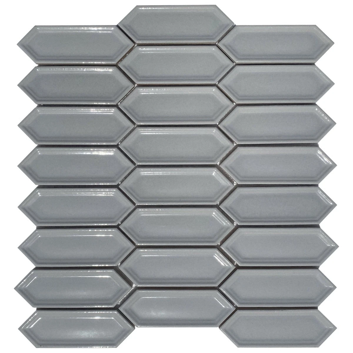 | Sold by: Sheet Sheet Size: 11.15″ x 11.6″ Chip Size: 1.25″ x 4.25″ Thickness: 5/16″ Material: Porcelain Color: Gray Finish: Glossy Collection:Porcelain Mosaic Tile | Area of use: |