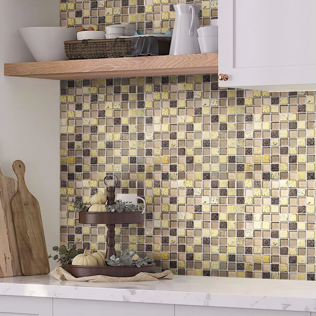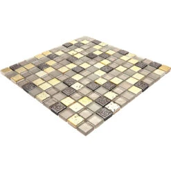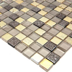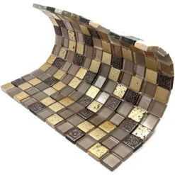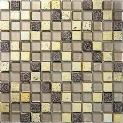 | Sold by: Sheet Sheet Size: 11.7″ x 11.7″ Chip Size: 0.9″x 0.9″/23 x 23 mm Thickness: 5/16″ Material: Glass, Resin, Stone Color: Beige, Brown Finish: Glossy, Foiled Recommended Adhesive: Laticrete Glass Tile Adhesive Lite Packing info: