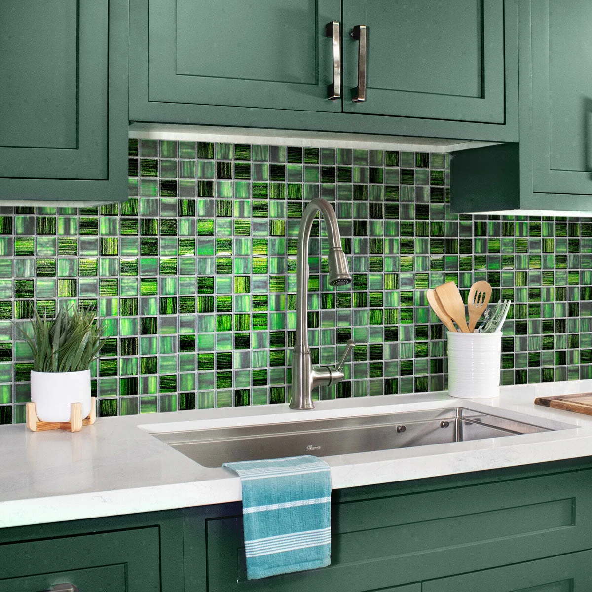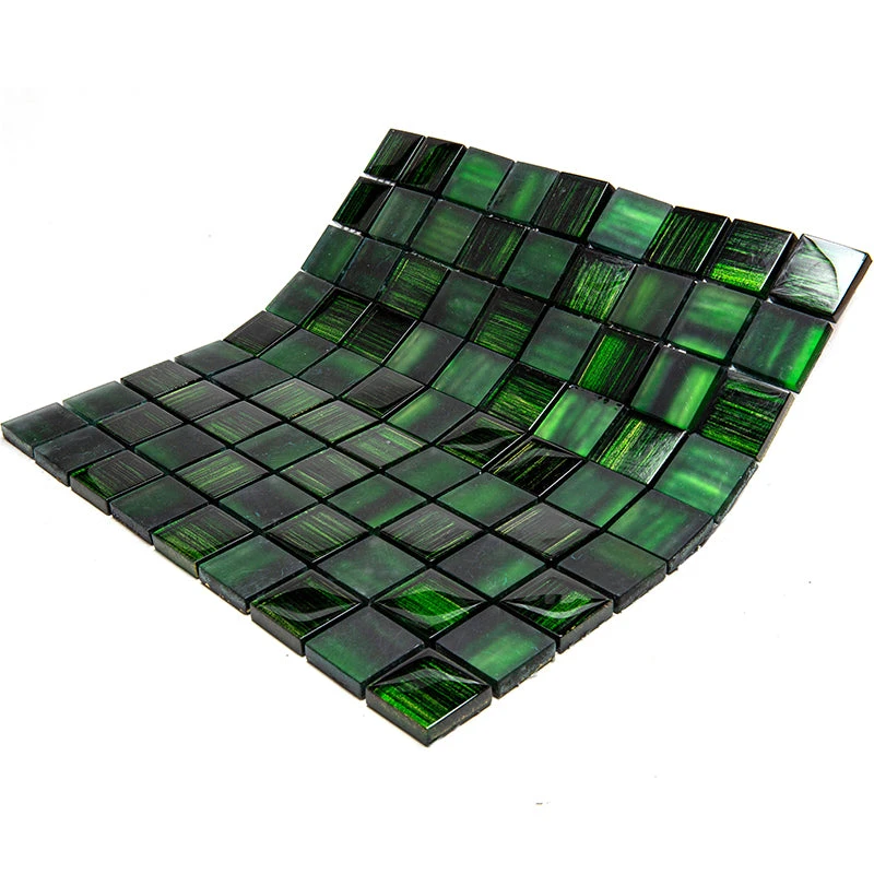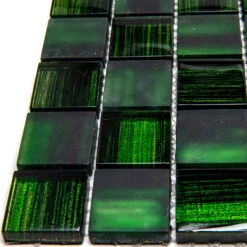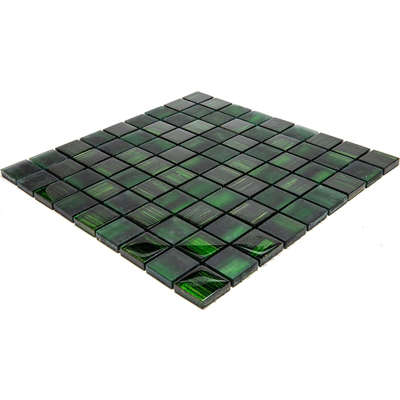 Bring a royal touch to your house with our nature-inspired Emerald Green mosaic tile. Chips of hazy matte green and clear glass tile mixed with shiny foil bring a unique touch of artistry to your space. Dark emerald green glass tile hues meet subtle shades of electric lime to add a tantalizing brightness into your interior design. All tile sheets are mounted on a mesh for easy and quick installation. The way these glass tiles are shaped provides more slip-resistance than regular glass tiles, which makes them ideal for moist-prone areas as a bathroom and laundry room. It is a great emerald green floor tile for residential and commercial settings. Applicable to various spaces, this square tile makes gorgeous accents as niches, décor borders, or kitchen backsplashes.
