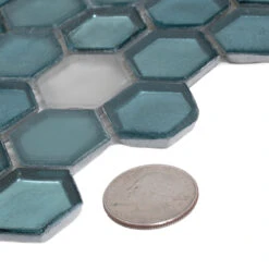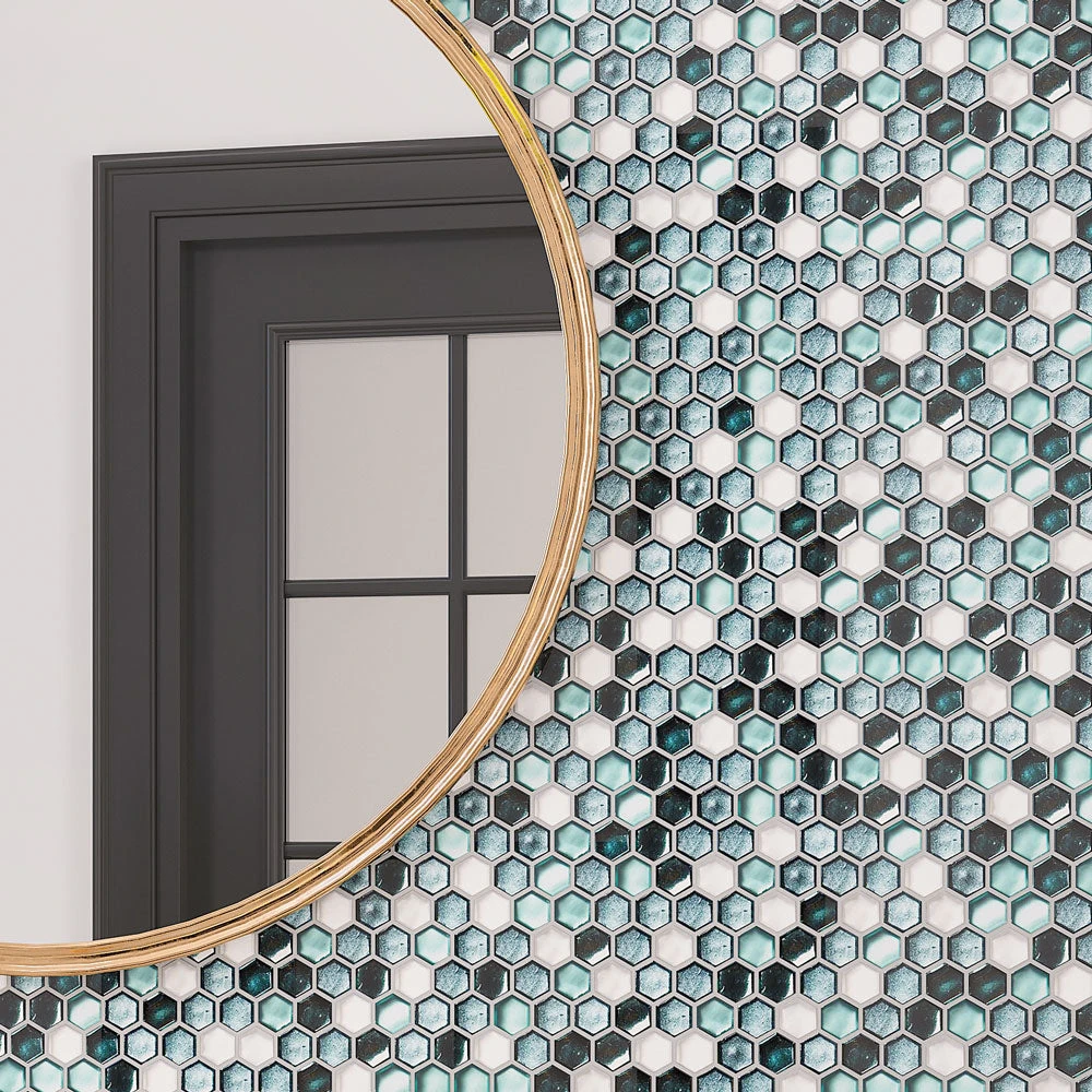 Emphasize your living space with the royal look of these glass mosaics. The abstract pattern of hexagon-shaped tile pieces creates a lively dramatic feel and builds a strong focal point. A gorgeous combination of pure white, dark emerald green, and aquamarine tile delivers a fresh, lush appeal that can enrich any home design project. Glass tiles do not require any extra maintenance and last a long time. Each square sheet lays on a mesh back for easy and quick installations. This emerald hexagon mosaic can be used for indoor projects only and is applicable to low-traffic floors and walls. Whether you want to cover an entire surface or use it as an accent, our emerald tiles will always be the center of attraction. Accentuate your kitchen, bathroom, laundry room, entrance, living room, or any other area needing an extra touch of glam. Use these hexagon mosaics for an alluring backsplash, feature wall, niche, border, or any other decorative piece.