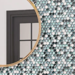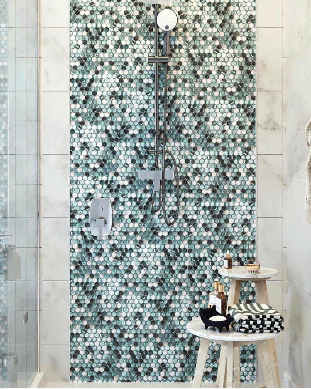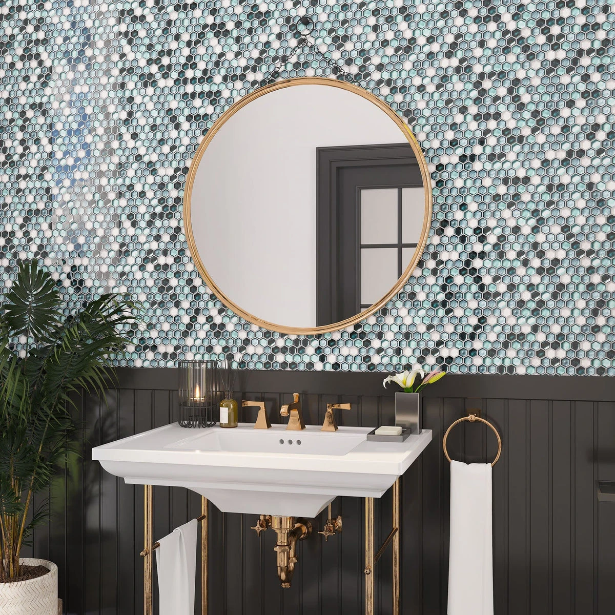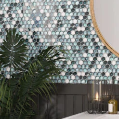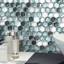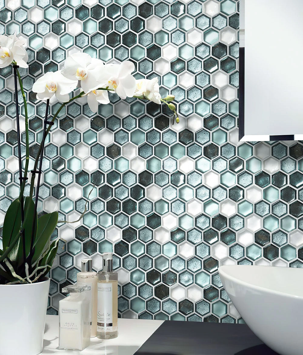 Rich and invigorating, white and dark emerald green tones have the potential to bring a sense of sophistication and calm to your interior space. Pair this gorgeous hexagon tile with brass fixtures and fittings to give a contemporary bathroom a true sense of grandeur. When used as a backsplash, accent wall, or to highlight design features in the bathroom, the richness of dark emerald green and aquamarine is perfectly poised for pulling off a nature-inspired aesthetic that feels like an inviting sanctuary at the end of each day. Team with earthy neutral shades like grey, beige and light brown. When introduced in an all-white bathroom with large decorative mirrors, this glass mosaic tile reflects light easily, elevating your functional space into a stunning oasis that feels bright, open, and airy.