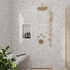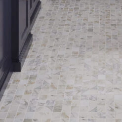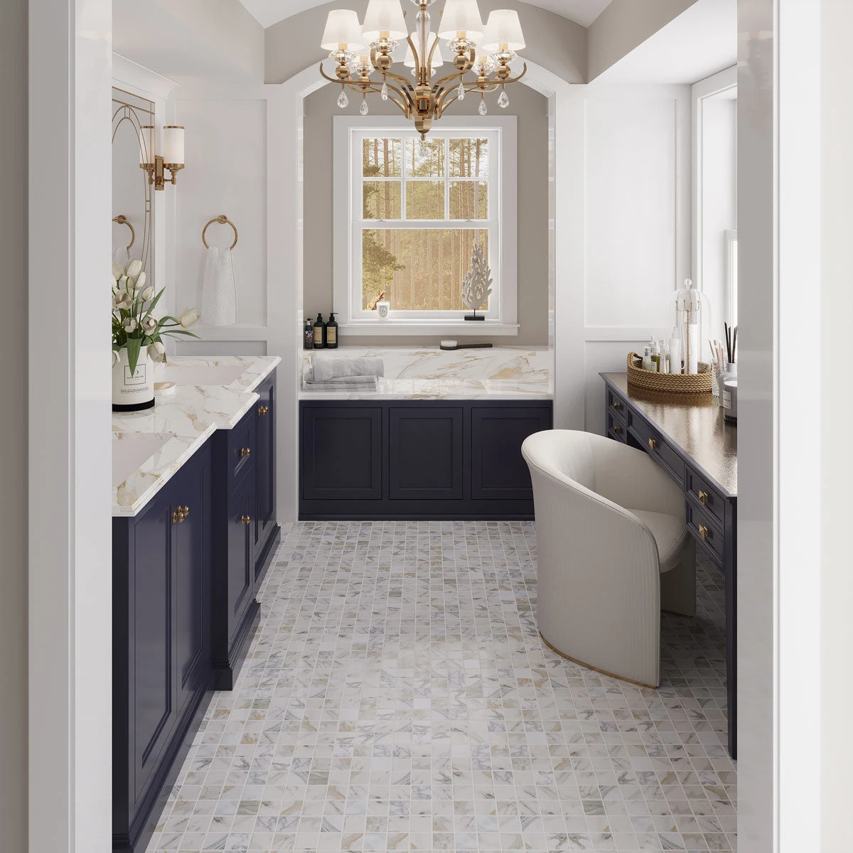 Welcome to the best of marble-inspired beauty! Emporio Calacatta Gold Mosaic is a square mosaic tile made of porcelain, designed with a matte finish in order to achieve the same timeless appeal of real Calacatta marble. Whether it be indoor or outdoor walls, residential and commercial floors, showers, steam rooms, swimming pools, backsplashes, laundry rooms, accent walls or fireplace surrounds – this product will add an unmistakeable touch of glamour and style!